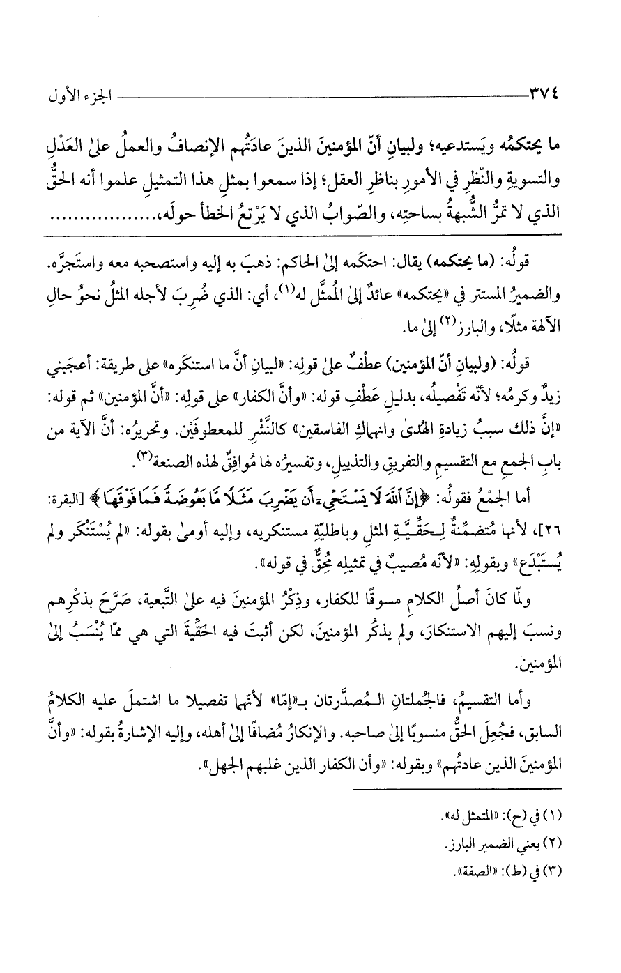 وأما التقسيم، فالجملتان المصدرتان بـ "إما" لأنهما تفصيلا ما اشتمل عليه الكلام السابق، فجعل الحق منسوباً إلى صاحبه. والإنكار مضافاً إلى أهله، وإليه الإشارة بقوله: "وأن المؤمنين الذين عادتهم" وبقوله: "وأن الكفار الذين غلبهم الجهل".