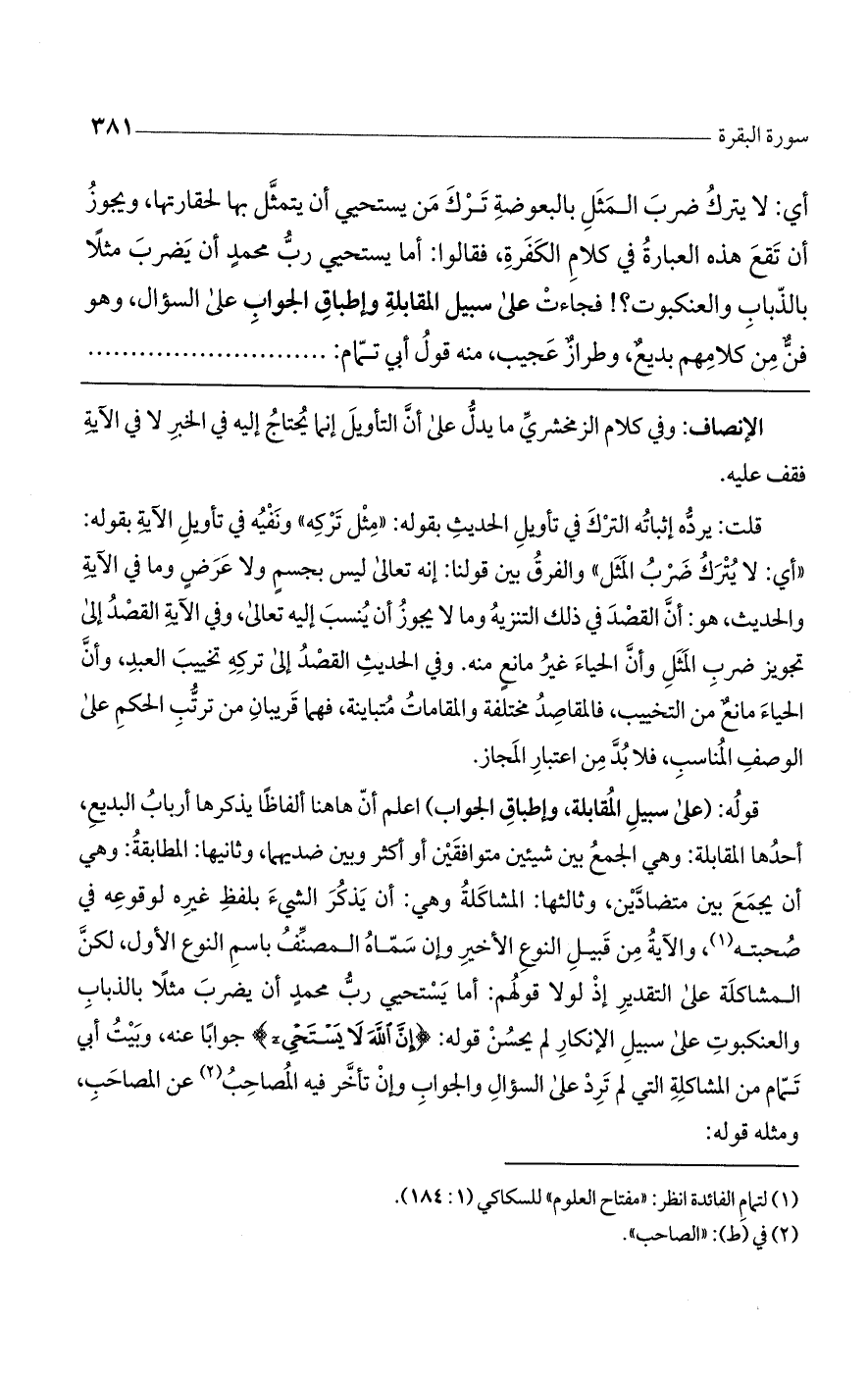 قوله: (على سبيل المقابلة، وإطباق الجواب) اعلم أن ها هنا ألفاظاً يذكرها أرباب البديع، أحدها المقابلة: وهي الجمع بين شيئين متوافقين أو أكثر وبين ضديهما، وثانيها: المطابقة: وهي أن يجمع بين متضادين، وثالثها: المشاكلة وهي: أن يذكر الشيء بلفظ غيره لوقوعه في صحبته، والآية من قبيل النوع الأخير وإن سماه المصنف باسم النوع الأول، لكن المشاكلة على التقدير إذ لولا قولهم: أما يستحيي رب محمدٍ أن يضرب مثلاً بالذباب والعنكبوت على سبيل الإنكار لم يحسن قوله: (إِنَّ اللَّهَ لَا يَسْتَحْيِي) جواباً عنه، وبيت أبي تمام من المشاكلة التي لم ترد على السؤال والجواب وإن تأخر فيه المصاحب عن المصاحب، ومثله قوله: