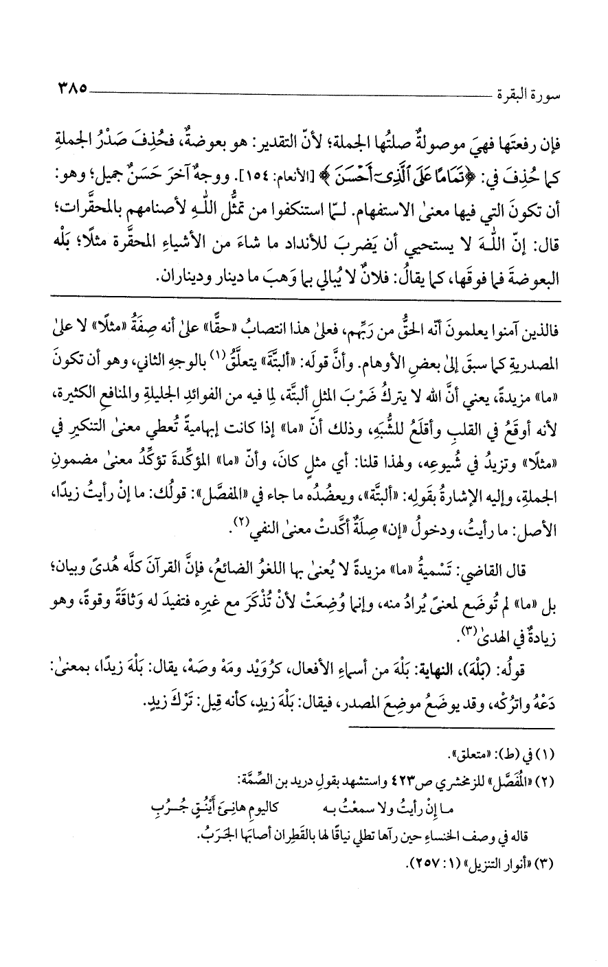 فالذين آمنوا يعلمون أنه الحق من ربهم، فعلى هذا انتصاب "حقاً" على أنه صفة "مثلاً" لا على المصدرية كما سبق إلى بعض الأوهام. وأن قوله: "ألبتة" يتعلق بالوجه الثاني، وهو أن تكون "ما" مزيدةً، يعني أن الله لا يترك ضرب المثل ألبتة، لما فيه من الفوائد الجليلة والمنافع الكثيرة، لأنه أوقع في القلب وأقلع للشبه، وذلك أن "ما" إذا كانت إبهاميةً تُعطي معنى التنكير في "مثلاً" وتزيد في شيوعه، ولهذا قلنا: أي مثلٍ كان، وأن "ما" المؤكدة تؤكد معنى مضمون الجملة، وإليه الإشارة بقوله: "ألبتة"، ويعضده ما جاء في "المفصل": قولك: ما إن رأيت زيداً، الأصل: ما رأيت، ودخول "إن" صلةٌ أكدت معنى النفي.