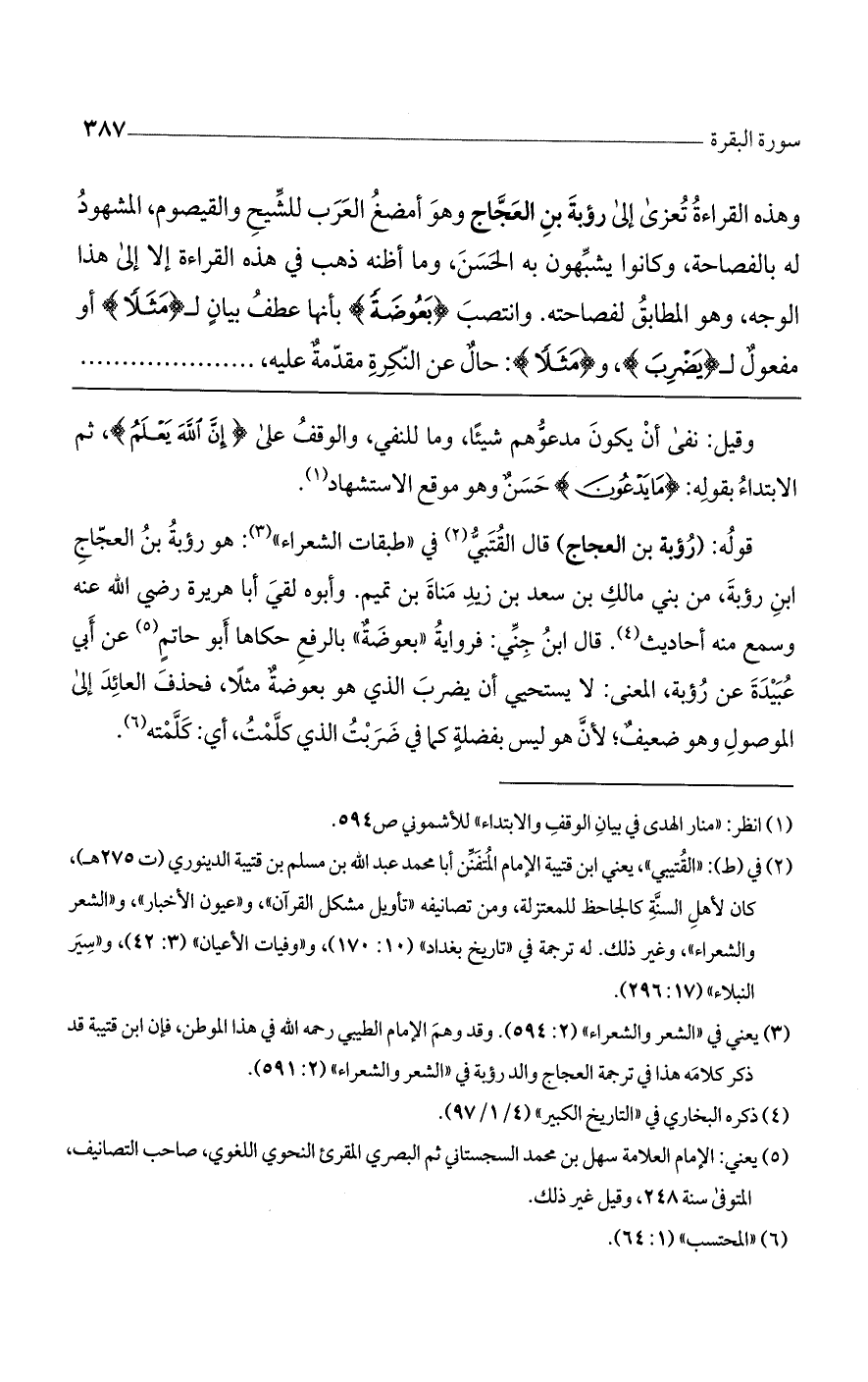 وهذه القراءة تُعزى إلى رؤبة بن العجاج، وهو أمضغ العرب للشيح والقيصوم، والمشهود له بالفصاحة، وكانوا يشبهون به الحسن، وما أظنه ذهب في هذه القراءة إلا إلى هذا الوجه، وهو المطابق لفصاحته. وانتصب (بَعُوضَةً) بأنها عطف بيان لـ (مثلاً). أو مفعول لـ (يضرب)، و (مَثَلًا): حال عن النكرة مقدمة عليه، .......
