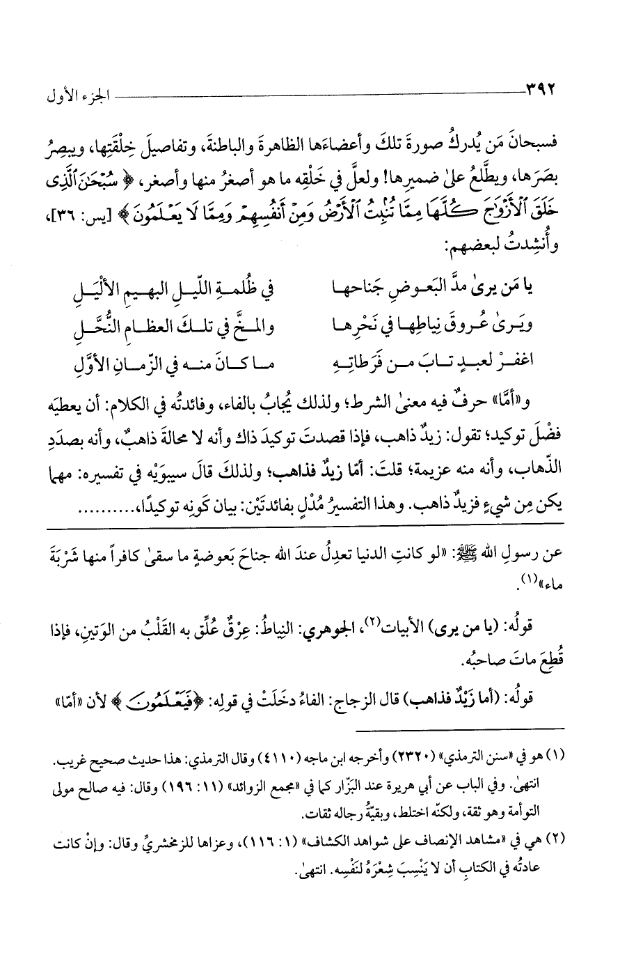 وفَأَمَّا حرف فيه معنى الشرط، ولذلك يجاب بالفاء. وفائدته في الكلام أن يعطيه فضل توكيد. تقول: زيد ذاهب. فإذا قصدت توكيد ذاك وأنه لا محالة ذاهب وأنه بصدد الذهاب وأنه منه عزيمة قلت: أمّا زيد فذاهب. ولذلك قال سيبويه في تفسيره: مهما يكن من شيء فزيد ذاهب. وهذا التفسير مدل بفائدتين: بيان كونه توكيداً، ....