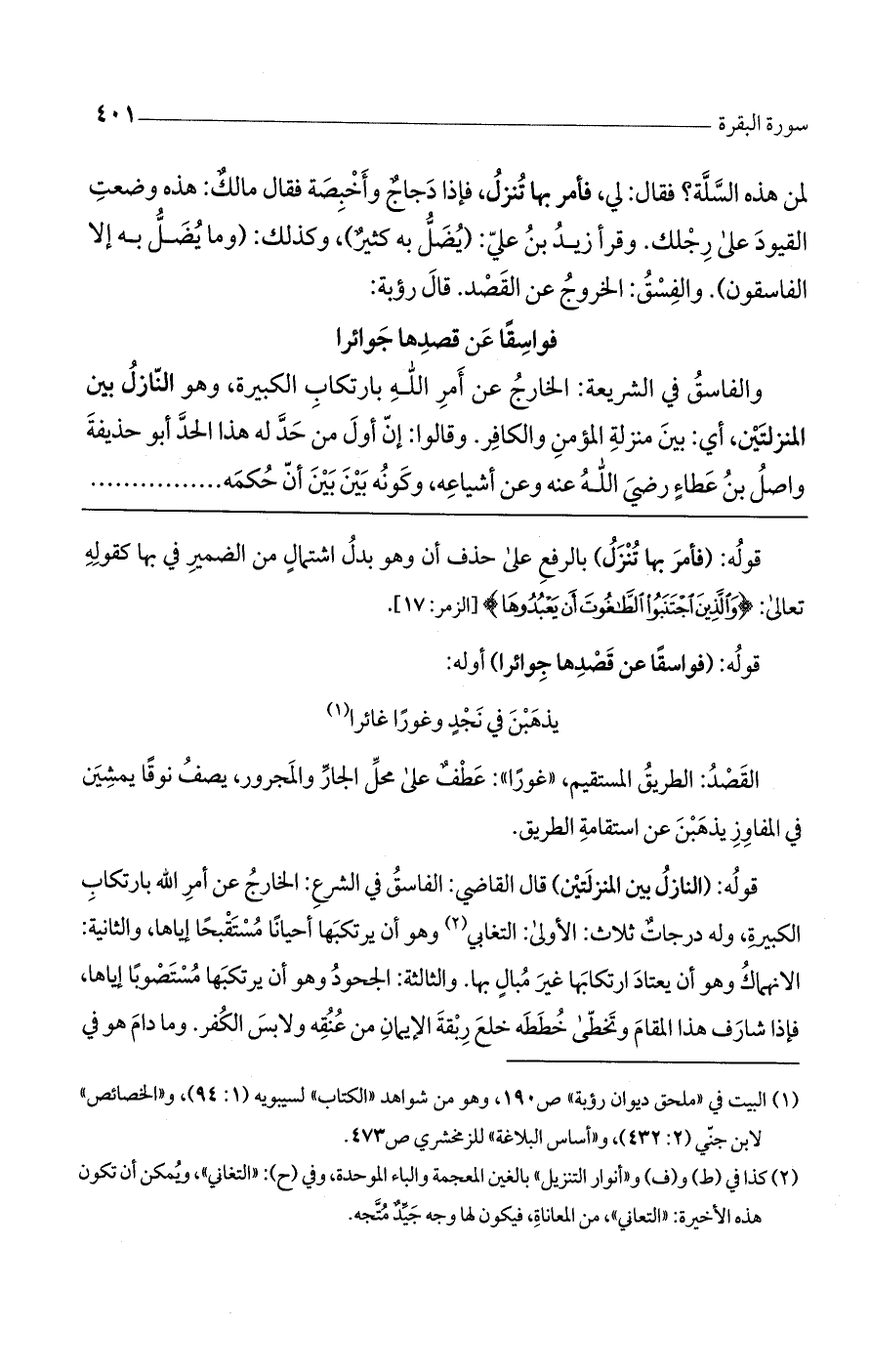 قوله: (النازل بين المنزلتين) قال القاضي: الفاسق في الشرع: الخارج عن أمر الله بارتكاب الكبيرة، وله درجاتٌ ثلاث: الأولى: التغابي وهو أن يرتكبها أحياناً مستقبحاً إياها، والثانية: الانهماك وهو أن يعتاد ارتكابها غير مبالٍ بها. والثالثة: الجحود وهو أن يرتكبها مستوصباً إياها، فإذا شارف هذا المقام وتخطى خططه خلع ربقة الإيمان من عنقه ولابس الكفر. وما دام هو في
