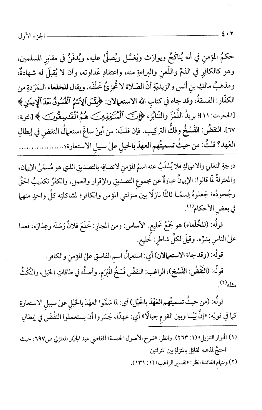 حكم المؤمن في أنه يناكح ويوارث ويغسل ويصلى عليه ويدفن في مقابر المسلمين. وهو كالكافر في الذمّ واللعن والبراءة منه واعتقاد عداوته، وأن لا تقبل له شهادة. ومذهب مالك بن أنس والزيدية: أنّ الصلاة لا تجزئ خلفه. ويقال للخلفاء المردة من الكفار: الفسقة. وقد جاء الاستعمالان في كتاب اللَّه. (بِئْسَ الِاسْمُ الْفُسُوقُ بَعْدَ الْإِيمانِ) [الحجرات: 11]. يريد اللمز والتنابز (إِنَّ الْمُنافِقِينَ هُمُ الْفاسِقُونَ) [التوبة: 67]. النقض: الفسخ وفك التركيب. فإن قلت: من أين ساغ استعمال النقض في إبطال العهد؟ قلت: من حيث تسميتهم العهد بالحبل على سبيل الاستعارة؛ .........