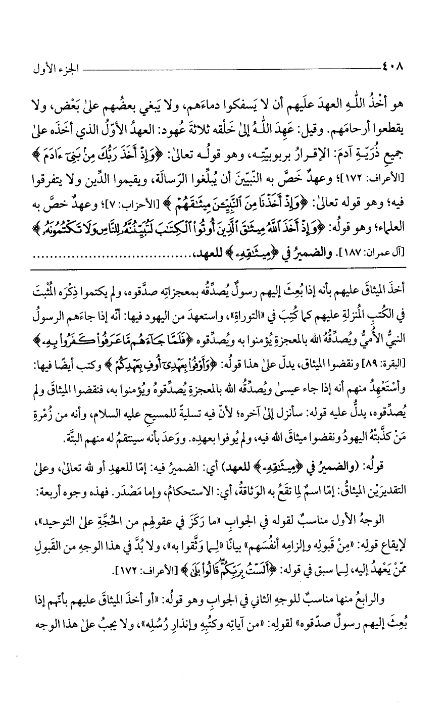 الوجه الأول مناسبٌ لقوله في الجواب "ما ركز في عقولهم من الحجة على التوحيد"، لإيقاع قوله: طمن قبوله وإلزامه أنفسهم" بياناً "لما وثقوا به"، ولا بد في هذا الوجه من القبول ممن يعهد إليه، لما سبق في قوله: (أَلَسْتُ بِرَبِّكُمْ قَالُوا بَلَى) [الأعراف: 172].