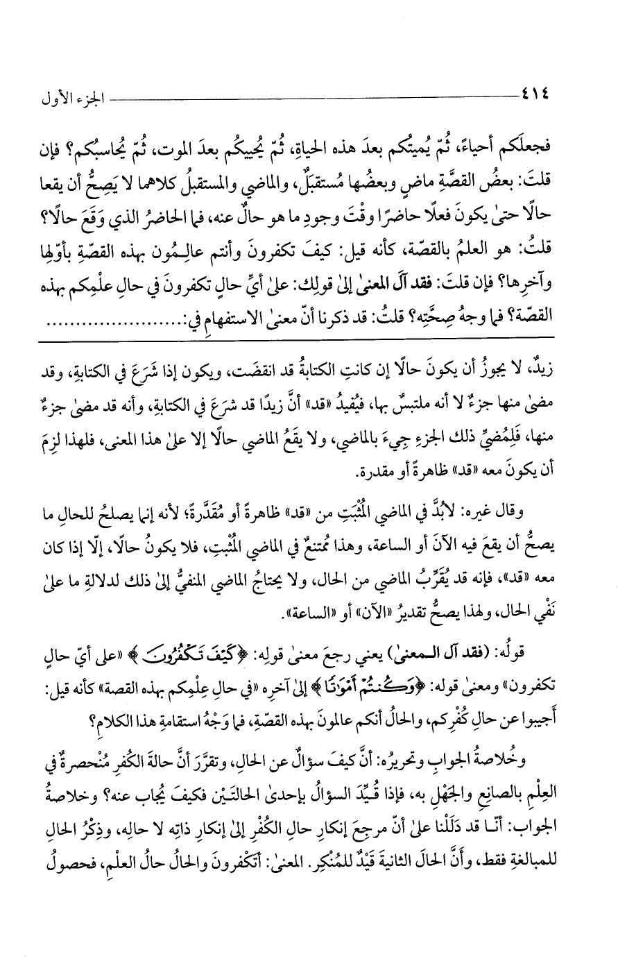 زيد، لا يجوز أن يكون حالاً إن كانت الكتابة قد انقضت، ويكون إذا شرع في الكتابة، وقد مضى منها جزء لا أنه ملتبس بها، فيفيد "قد" أن زيداً قد شرع في الكتابة، وأنه قد مضى جزء منها، فلمضي ذلك الجزء جيء بالماضي، ولا يقع الماضي حالاً إلا على هذا المعنى، فلهذا لزم أن يكون معه "قد" ظاهرة أو مقدرة.