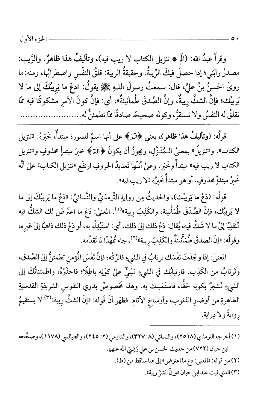 المعنى: إذا وجدت نفسك ترتاب في الشيء فاتركه؛ فإن نفس المؤمن تطمئن إلى الصدق، وترتاب من الكذب. فارتيابك في الشيء مبني على كونه باطلا؛ فاحذره، واطمئنانك إلى الشيء مشعر بكونه حقا، فاستمسك به. وهذا مخصوص بذوي النفوس الشريفة القدسية الطاهرة من أوضار الذنوب، وأوساخ الآثام. فظهر أن قوله: ((إن الشك ريبة)) لا يستقيم رواية ولا دراية.