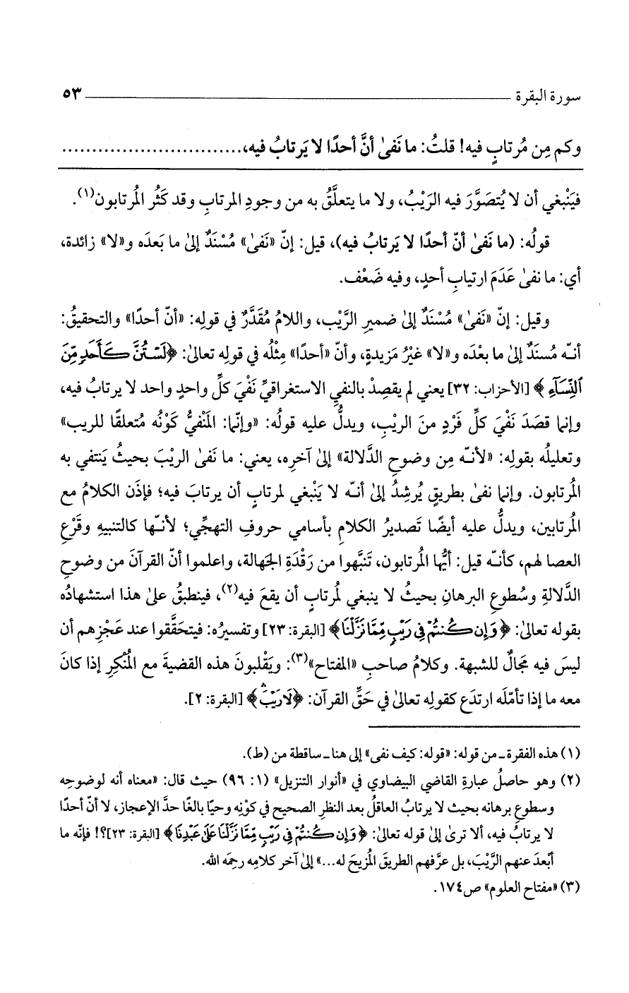 وقيل: أن ((نفى)) مسند إلى ضمير الريب، واللام مقدر في قوله: ((أن أحدا)) والتحقيق: أنه مسند إلى ما بعده و ((لا)) غير مزيدة، وأن ((أحدا)) مثله في قوله تعالى: ((لَسْتُنَّ كَأَحَدٍ مِنَ النِّسَاءِ)) [الأحزاب: 32] يعني لم يقصد بالنفي الاستغراقي نفي كل واحد واحد لا يرتاب فيه، وإنما قصد نفي كل فرد من الريب، ويدل عليه قوله: ((وإنما: المنفي كونه متعلقا للريب)) وتعليله بقوله: ((لأنه من وضوح الدلالة)) إلى آخره، يعنى: ما نفى الريب بحيث ينتفي به المرتابون وإنما نفى المرتابون. وإنما نفي بطريق يرشد إلى أنه لا ينبغي لمرتاب أن يرتاب فيه؛ فإذن الكلام مع المرتابين، ويدل عليه أيضا تصدير الكلام بأسامي حروف التهجي؛ لأنها كالتنبيه وقرع العصا لهم، كأنه قيل: أيها المرتابون، تنبهوا من رقدة الجهالة، واعلموا أن القرآن من وضوح الدلالة وسطوع البرهان بحيث لا ينبغي لمرتاب أن يقع فيه، فينطلق على هذا استشهاده بقوله تعالى: (وَإِنْ كُنْتُمْ فِي رَيْبٍ مِمَّا نَزَّلْنَا) [البقرة: 23] وتفسيره: فيتحققوا عند عجزهم أن ليس فيه مجال للشبهة. وكلام صاحب ((المفتاح)): ويقلبون هذه القضية مع المنكر إذا كان معه ما إذا تأمله ارتدع كقوله تعالى في حق القرآن: (لَا رَيْبَ) [البقرة: 2].