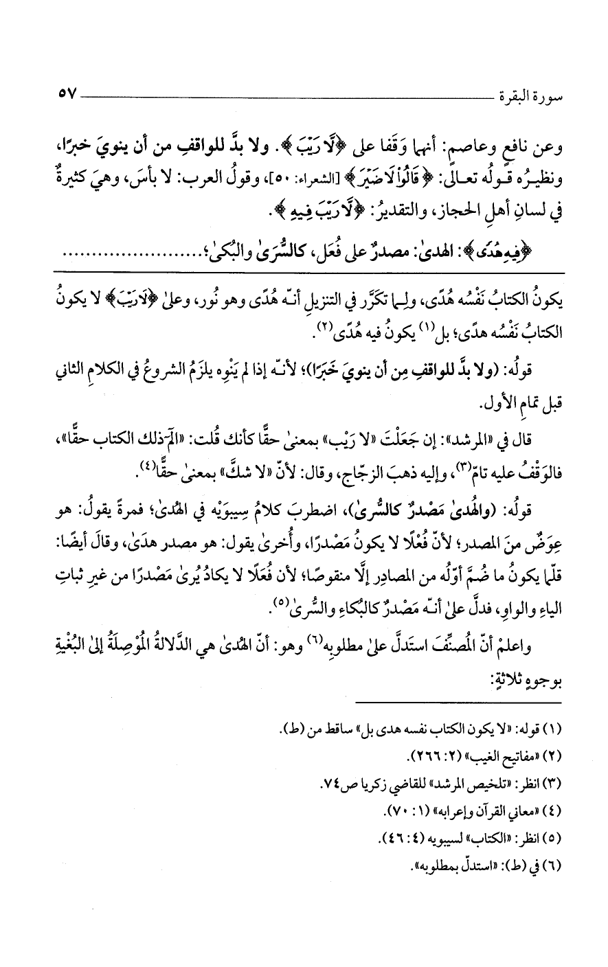 يكون الكتاب نفسه هدي، ولما تكرر في التنزيل أنه هدي وهو نور، وعلى (لا ريب) لا يكون الكتاب نفسه هدي؛ بل يكون فيه هدي.