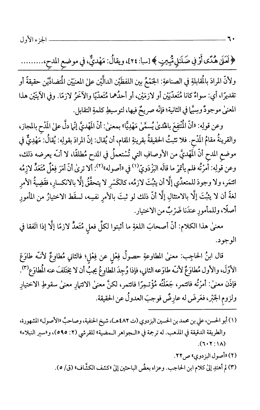 وعن قوله: "أن المنتفع بالهدى يسمى مهديًا" بمعنى: أن المهدي إنما دل على المدح بالمجاز، والقرينة مقام المدح. فلا تثبت الحقيقة بقرينة المقام، أن يقال: إن المراد بقوله: يقال: مهدي في موضع المدح أن المهدي من الأوصاف التي تستعمل في المدح مطلقًا، لا أنه يعرضه ذلك، وعن قوله: أمرته فلم يأتمر ما قاله البزدوي في "اصوله": ألا ترى أن أمر فعل متعد لازمة ائتمر، ولا وجود للمتعدي إلا أن يثبت لازمه، كالكسر لا يتحقق إلا بالانكسار، فقضيته الأمر لغة أن لا يثبت إلا بالامتثال إلا أن ذلك لو ثبت بالأمر نفسه، لسقط الاختيار من المأمور أصلاً، وللمأمور عندنا ضرب من الاختيار.