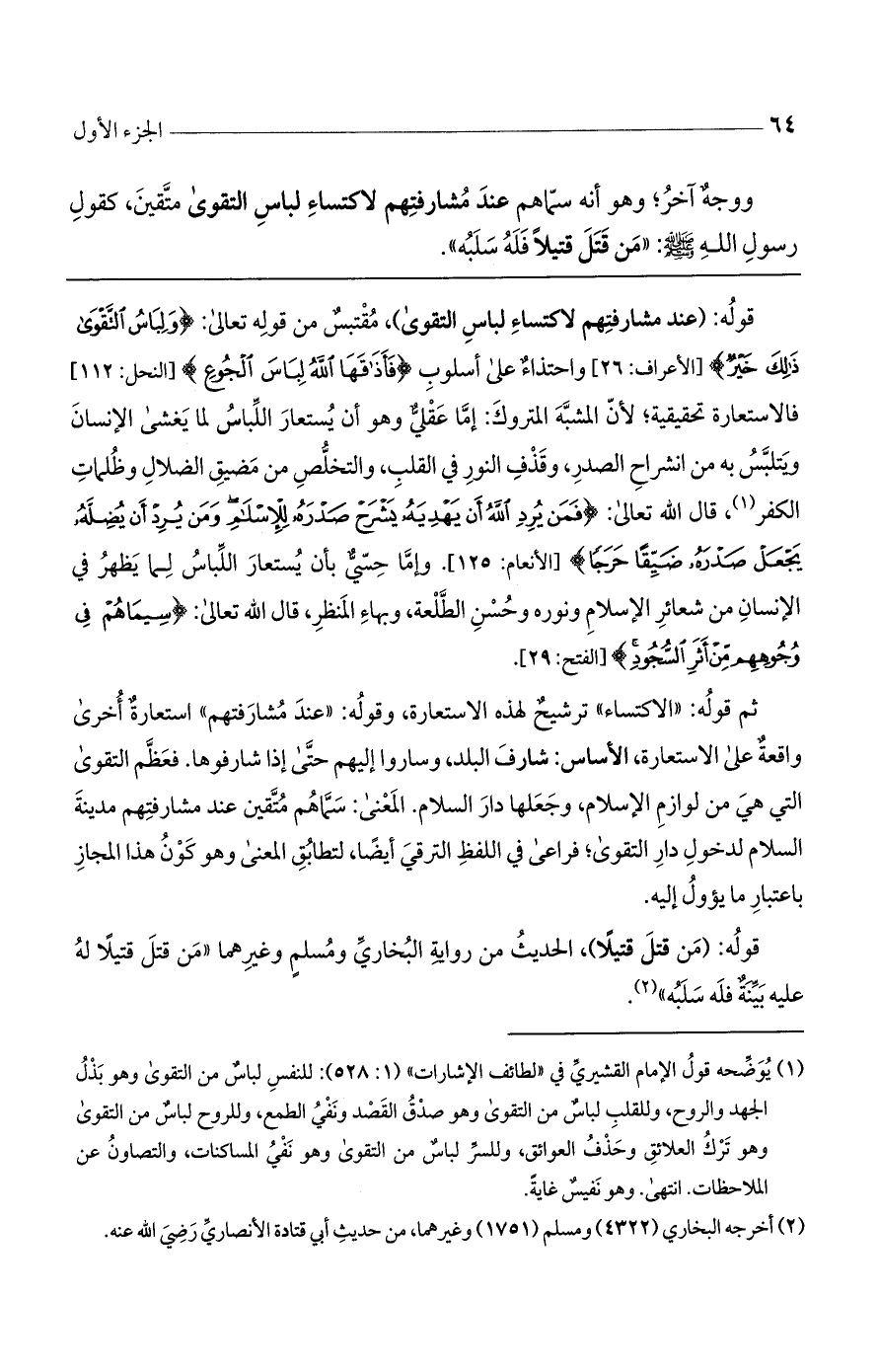 قوله: (عند مشارفتهم لاكتساء لباس التقوى)، مقتبس من قوله تعالى: (وَلِبَاسُ التَّقْوَى ذَلِكَ خَيْرٌ) [الأعراف: 26] واحتذاء على أسلوب (فَأَذَاقَهَا اللَّهُ لِبَاسَ الْجُوعِ) [النحل: 112] فالاستعارة تحقيقية؛ لأن المشبه المتروك: إما عقلي وهو أن يستعار اللباس لماي غشى الإنسان ويتلبس به من انشراح الصدر، وقذف النور في القلب، والتخلص من مضيق الضلال وظلمات الكفر، قال الله تعالى: (فَمَنْ يُرِدِ اللَّهُ أَنْ يَهدِيَهُ يَشْرَحْ صَدْرَهُ لِلْإِسْلَامِ وَمَنْ يُرِدْ أَنْ يُضِلَّهُ يَجْعَلْ صَدْرَهُ ضَيِّقًا حَرَجًا) [الأنعام: 125]. وإما حسي بأن يستعار اللباس لماي ظهر في الإنسان من شعائر الإسلام ونوره وحسن الطلعة، وبهاء المنظر، قال الله تعالى: (سِيمَاهُمْ فِي وُجُوهِهِمْ مِنْ أَثَرِ السُّجُودِ) [الفتح: 29].