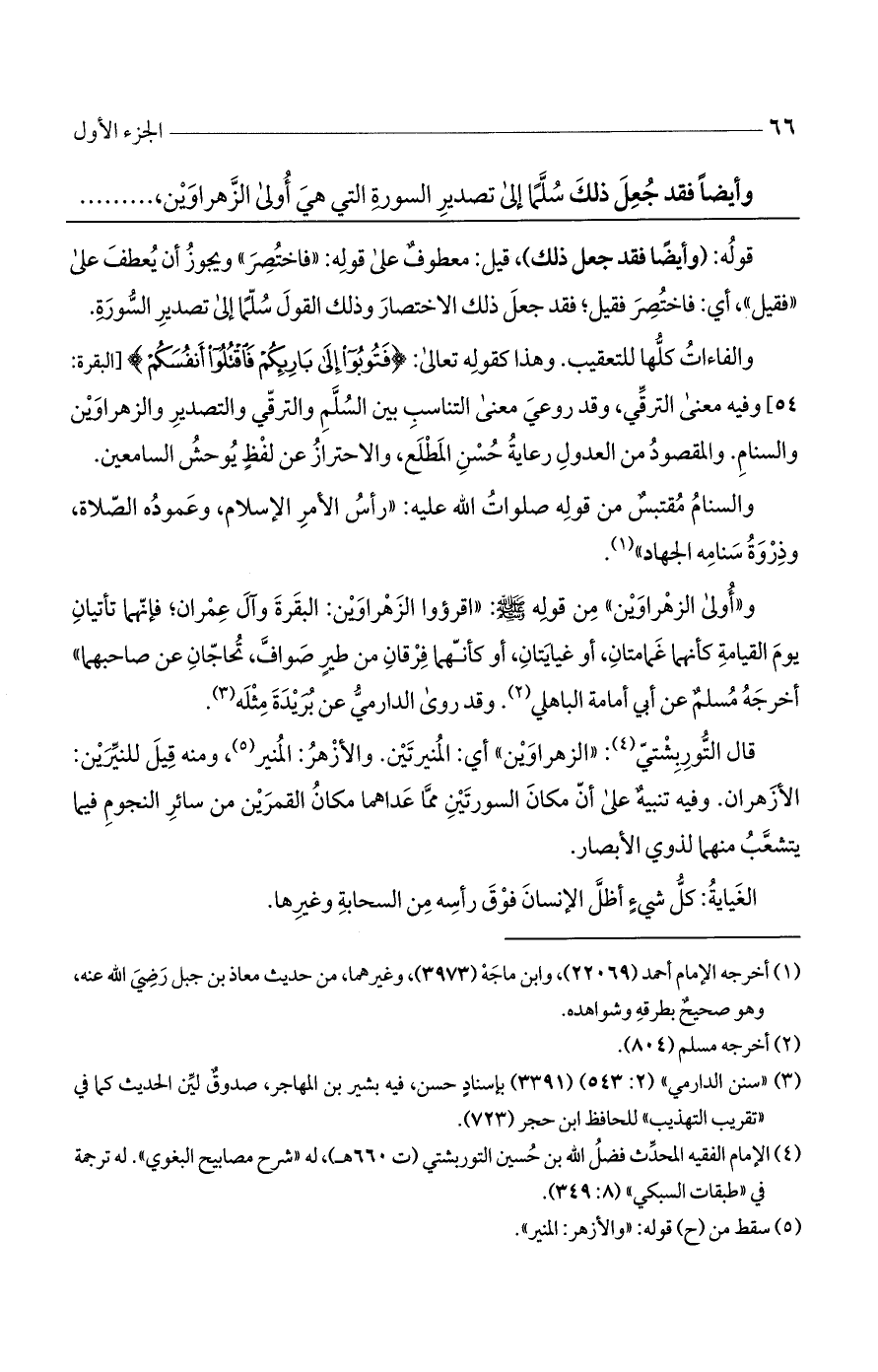 و"أولى الزهراوين" من قوله - صلى الله عليه وسلم -: "اقرؤوا الزهراوين: البقرة وآل عمران، فإنهما تأتيان يوم القيامة كأنهما غمامتان، أو غيايتان، أو كأنهما فرقان من طير صواف، تحاجان عن صاحبهما" أخرجه مسلم عن أبي أمامة الباهلي، وقد روى الدارمي عن بريدة مثله.