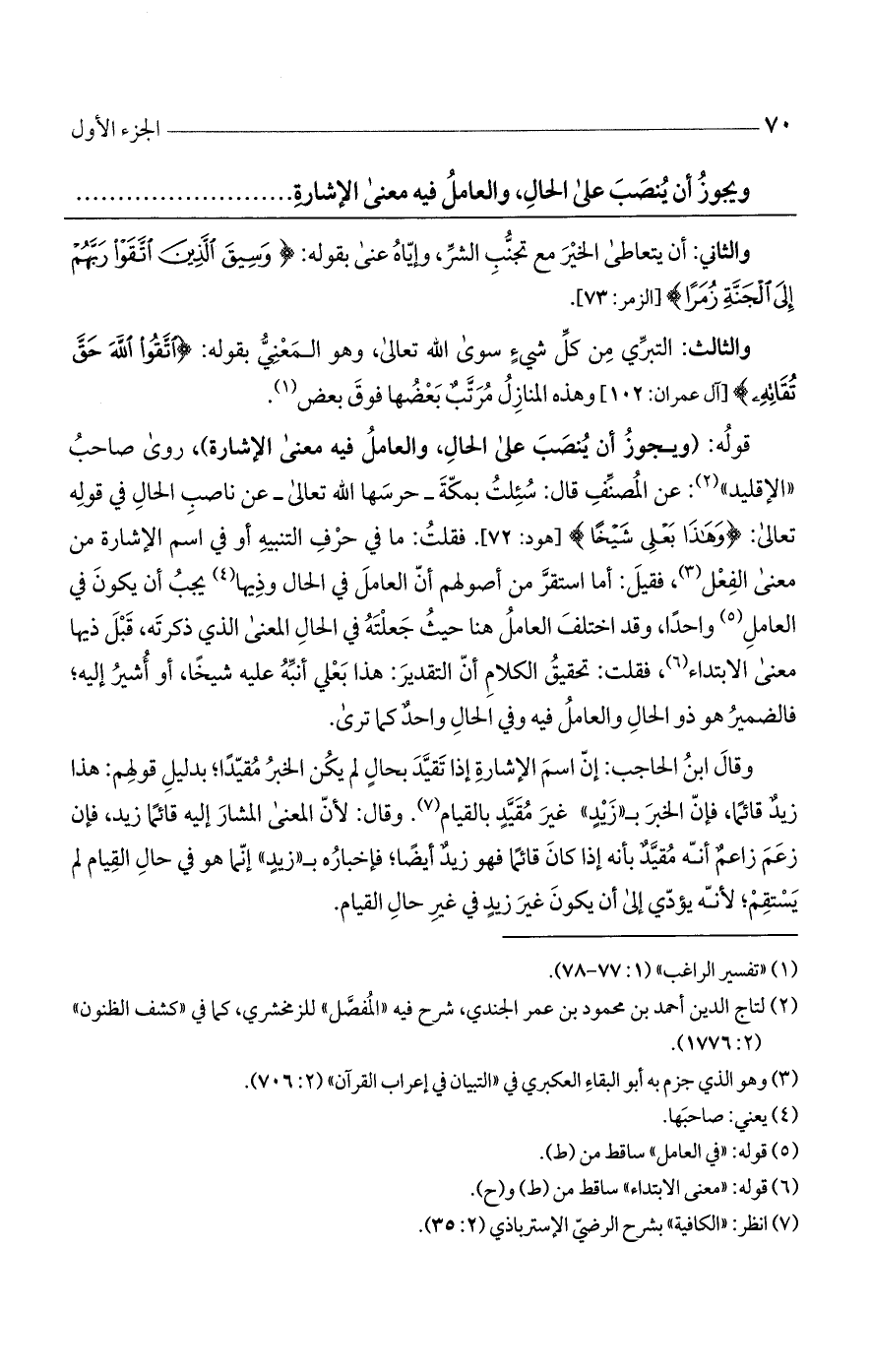 وقال ابن الحاجب: إن اسم الإشارة إذا تقيد بحال لم يكن الخير مقيدًا؛ بدليل قولهم: هذا زيد قائمًا، فإن الخبر بـ"زيد" غير مقيد بالقيام. وقال: لأن المعنى المشار إليه قائمًا زيد، فإن زعم زاعم أنه مقيد بأنه إذا كان قائمًا فهو زيد أيضًا، فإخباره بـ"زيد" إنما هو في حال القيام لم يستقيم؛ لأنه يؤدي إلى أن يكون غير زيد في غير حال القيام.