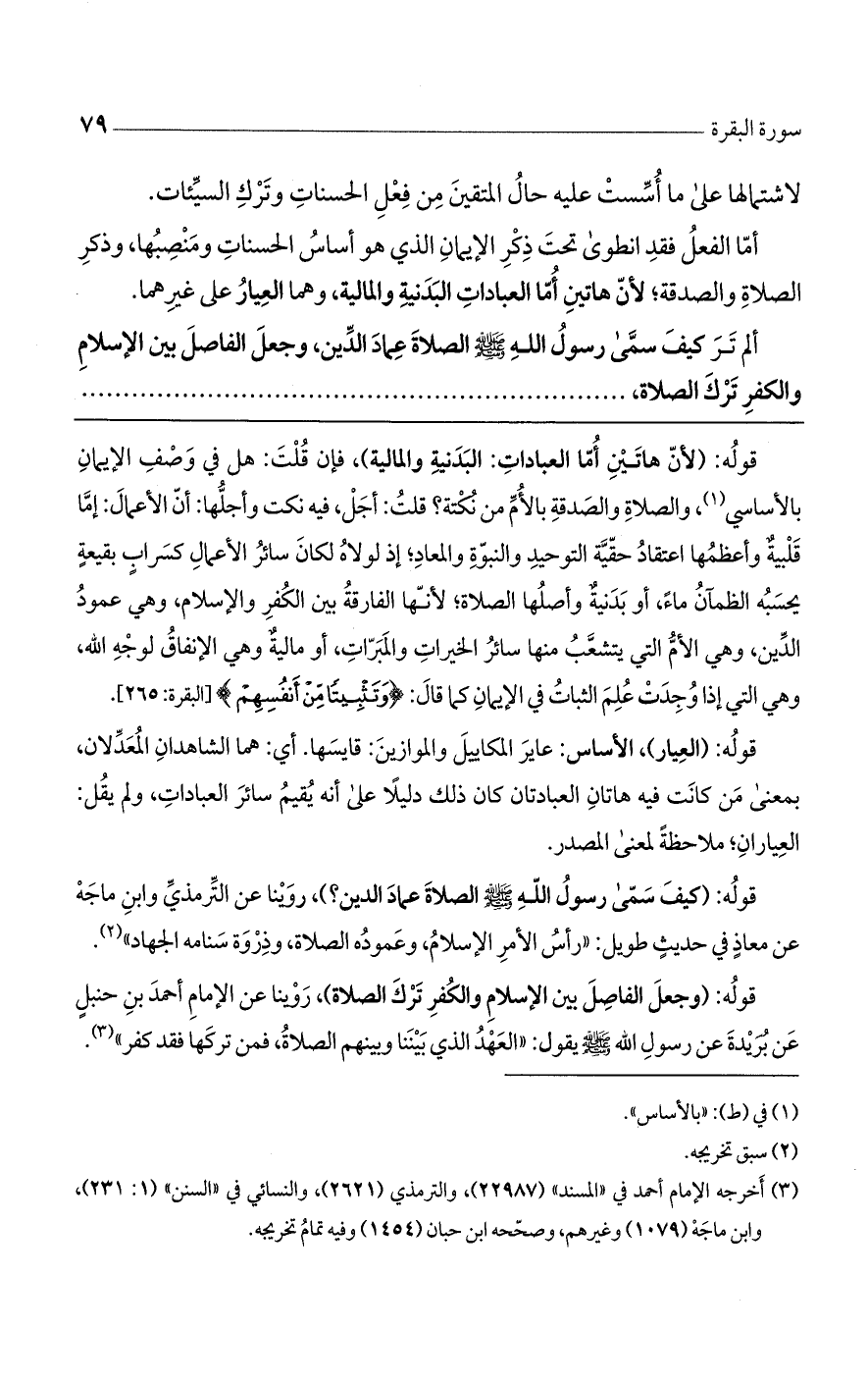 قوله: (كيف سمى رسول الله صلى الله عليه وسلم عماد الدين؟ )، روينا عن الترمذي وابن ماجه عن معاذٍ في حديث طويل: "رأس الأمر الإسلام، وعموده الصلاة، وذروة سنامه الجهاد".
