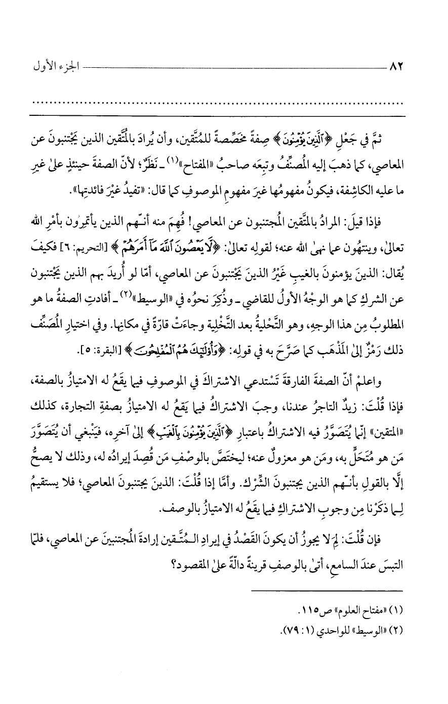ثم في جعل (الَّذِينَ يُؤْمِنُونَ) صفةً مخصصةً للمتقين، وأن يراد بالمتقين الذين يجتنبون عن المعاصي، كما ذهب إليه المصنف وتبعه صاحب "المفتاح"- نظرٌ؛ لأن الصفة حينئذٍ على غير ما عليه الكاشفة، فيكون مفهومها غير مفهوم الموصوف كما قال: "تفيد غير فائدتها".