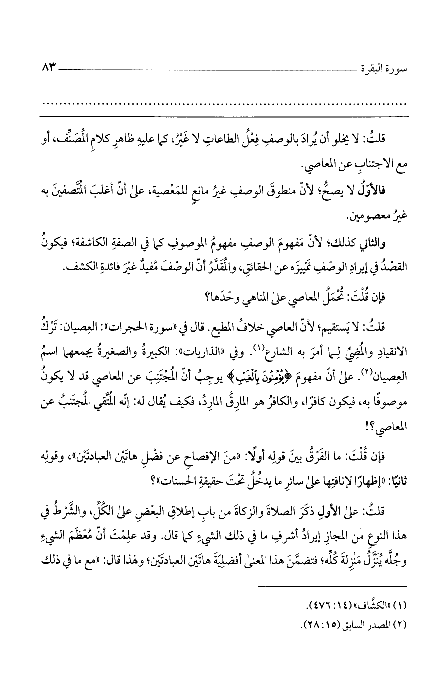 قلت: لا يستقيم؛ لأن العاصي خلاف المطيع. قال في "سورة الحجرات": العصيان: ترك الانقياد والمضي لما أمر به الشارع. وفي "الذاريات": الكبيرة والصغيرة يجمعهما اسم العصيان. على أن مفهوم (يُؤْمِنُونَ بِالْغَيْبِ) يوجب أن المجتنب عن المعاصي قد لا يكون موصوفاً به، فيكون كافراً، والكافر هو المارق المارد، فكيف يقال له: إنه المتقي المجتنب عن المعاصي؟ !