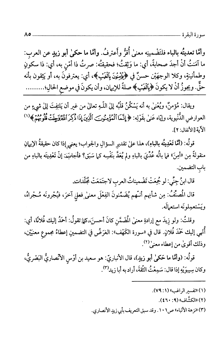 وأمّا تعديته بالباء فلتضمينه معنى أقرّ وأعترف. وأمّا ما حكى أبو زيد عن العرب: ما آمنت أن أجد صحابة - أى ما وثقت - فحقيقته: صرت ذا أمن به، أى ذا سكون وطمأنينة، وكلا الوجهين حسن في (يُؤْمِنُونَ بِالْغَيْبِ) أى يعترفون به أو يثقون بأنه حق. ويجوز أن لا يكون (بالغيب) صلة للإيمان، وأن يكون في موضع الحال؛