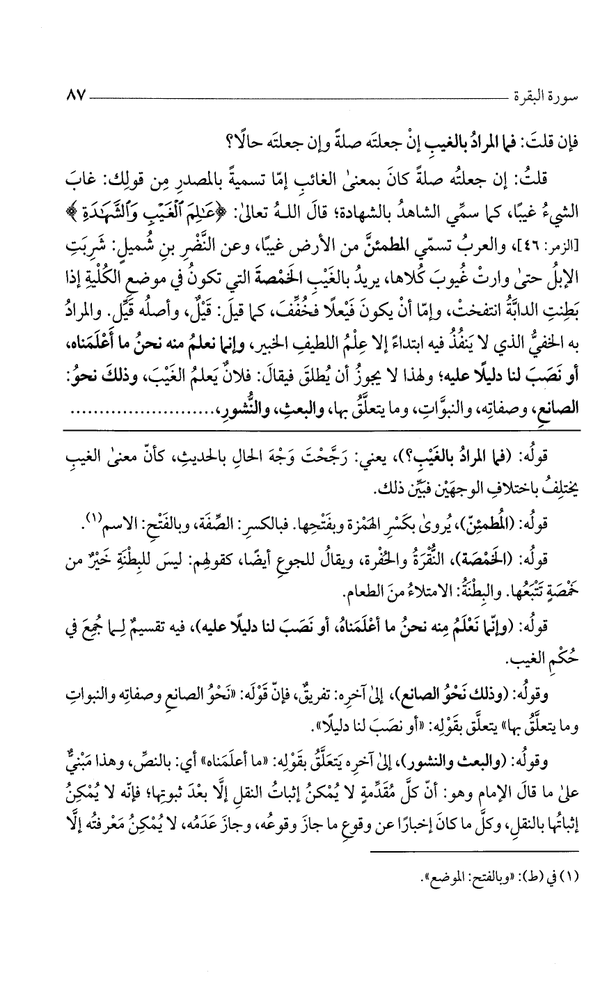 فإن قلت: فما المراد بالغيب إن جعلته صلة؟ وإن جعلته حالا؟ قلت: إن جعلته صلة كان بمعنى الغائب، إمّا تسمية بالمصدر من قولك. غاب الشيء غيبا، كما سمى الشاهد بالشهادة. قال اللَّه تعالى: (عالِمُ الْغَيْبِ وَالشَّهادَةِ) [الزمر: 46]. والعرب تسمى المطمئن من الأرض غيباً. وعن النضر بن شميل: شربت الإبل حتى وارت غيوب كلاها. يريد بالغيب: الخمصة التي تكون في موضع الكلية، إذا بطنت الدابة انتفخت. وإما أن يكون فيعلا فخفف، كما قيل «قيل» وأصله: قيل: والمراد به الخفي الذي لا ينفذ فيه ابتداء إلا علم اللطيف الخبير، وإنما نعلم منه نحن ما أعلمناه، أو نصب لنا دليلا عليه. ولهذا لا يجوز أن يطلق فيقال: فلان يعلم الغيب. وذلك نحو الصانع وصفاته، والنبوّات وما يتعلق بها، والبعث والنشور،