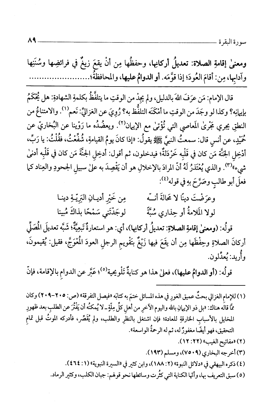قوله: (ومعنى إقامة الصلاة: تعديل أركانها)، أي: هو استعارةٌ تبعيةٌ؛ شبه تعديل المصلي أركان الصلاة وحفظها من أن يقع فيها زيغٌ بتقويم الرجل العود المعوج، فقيل: يقيمون، وأريد: يعدلون.
