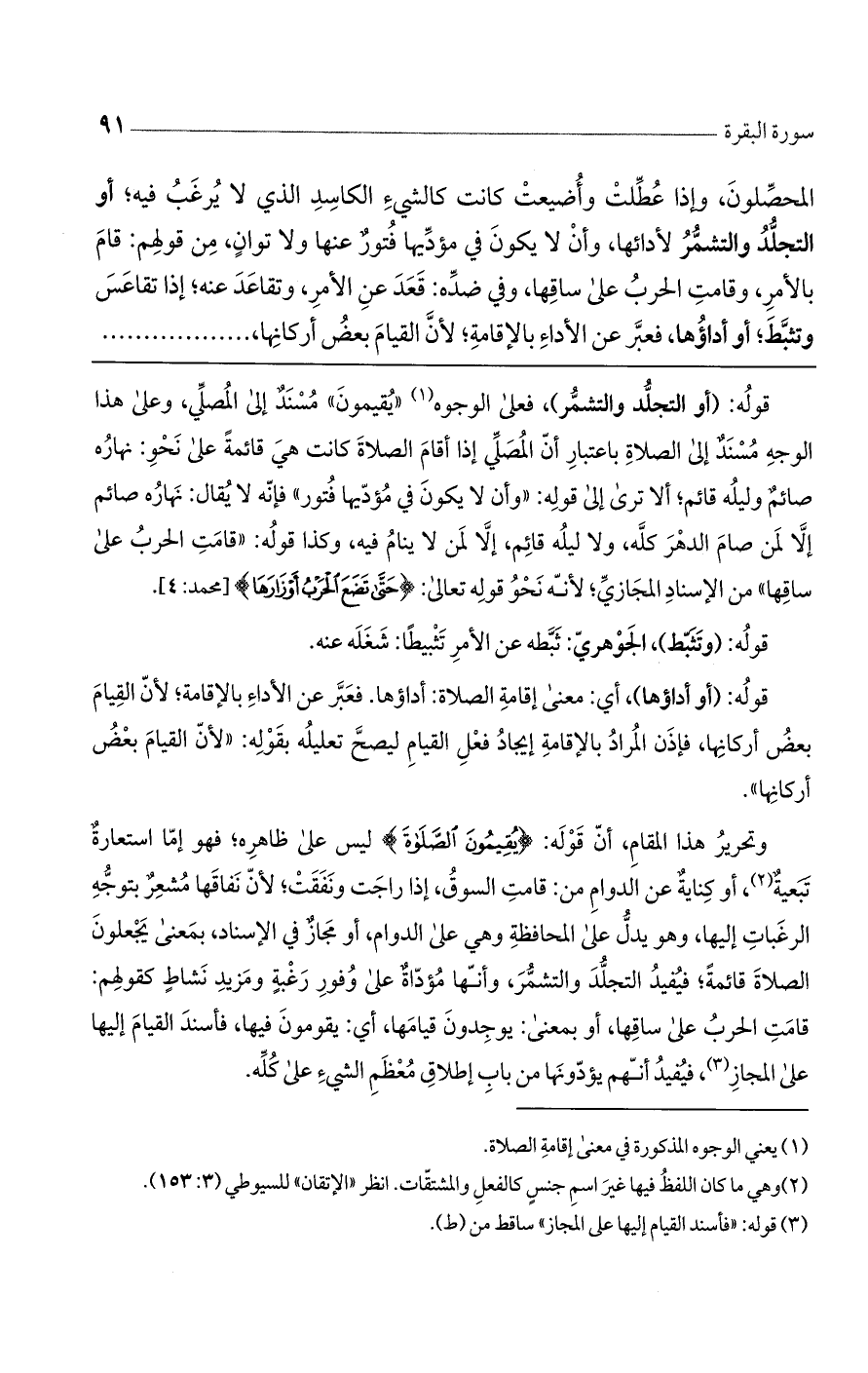 قوله: (أو التجلد والتشمر)، فعلى الوجوه "يقيمون" مسندٌ إلى المصلي، وعلى هذا الوجه مسندٌ إلى الصلاة باعتبار أن المصلي إذا أقام الصلاة كانت هي قائمةً على نحو: نهاره صائمٌ وليله قائم؛ ألا ترى إلى قوله: "وأن لا يكون في مؤديها فتور" فإنه لا يقال: نهاره صائم إلا لمن صام الدهر كله، ولا ليله قائم، إلا لمن لا ينام فيه، وكذا قوله: "قامت الحرب على ساقها" من الإسناد المجازي؛ لأنه نحو قوله تعالى: (حَتَّى تَضَعَ الْحَرْبُ أَوْزَارَهَا) [محمد: 4].
