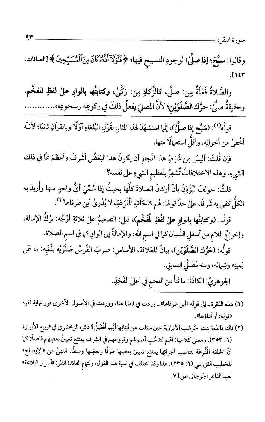 والصلاة: فعلة من صلى، كالزكاة من زكى. وكتابتها بالواو على لفظ المفخم. وحقيقة صلى: حرّك الصلوين لأن المصلى يفعل ذلك في ركوعه وسجوده،