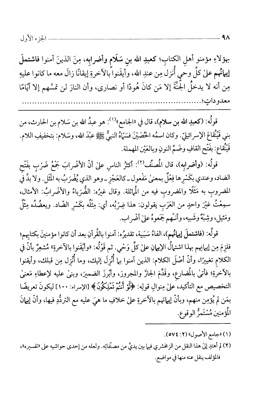 قوله: (كعبد الله بن سلام)، قال في "الجامع": هو عبد الله بن سلام بن الحارث، من بني قينقاع الإسرائيلي. وكان اسمه الحصين فسماه النبي صلى الله عليه وسلم عبد الله، وسلام: بتخفيف اللام. قينقاع: بفتح القاف وضم النون وبالعين المهملة.