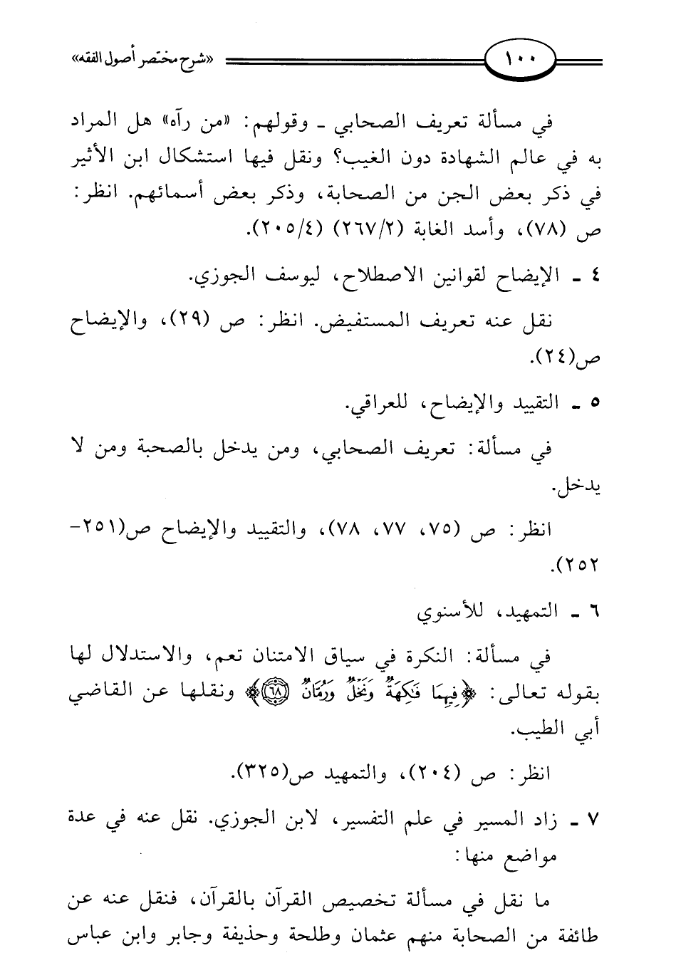 في مسألة تعريف الصحابي- وقولهم: "من رآه" هل المراد به في عالم الشهادة دون الغيب؟ ونقل فيها استشكال ابن الأثير في ذكر بعض الجن من الصحابة، وذكر بعض أسمائهم. انظر: ص (78)، وأسد الغابة (2/ 267) (4/ 205).