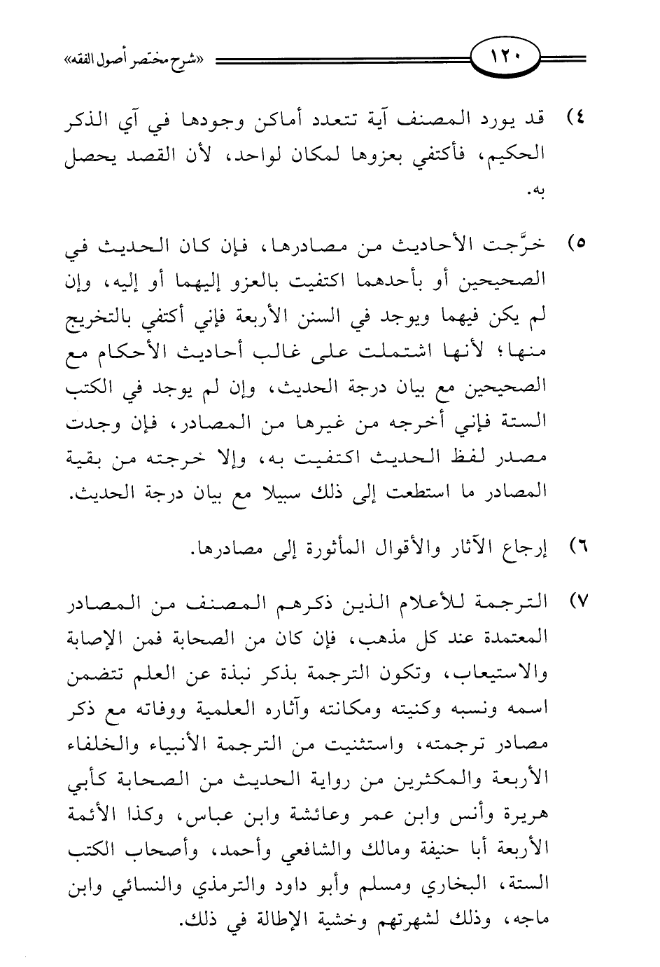 7) الترجمة للأعلام الذين ذكرهم المصنف من المصادر المعتمدة عند كل مذهب، فإن كان من الصحابة فمن الإصابة والاستيعاب، وتكون الترجمة بذكر نبذة عن العلم تتضمن اسمه ونسبه وكنيته ومكانته وآثاره العلمية ووفاته مع ذكر مصادر ترجمته، واستثنيت من الترجمة الأنبياء والخلفاء الأربعة والمكثرين من رواية الحديث من الصحابة كأبي هريرة وأنس وابن عمر وعائشة وابن عباس، وكذا الأئمة الأربعة أبا حنيفة ومالك والشَّافعيّ وأحمد، وأصحاب الكتب الستة، البخاري ومسلم وأبو داود والترمذي والنَّسائيُّ وابن ماجه، وذلك لشهرتهم وخشية الإطالة في ذلك.