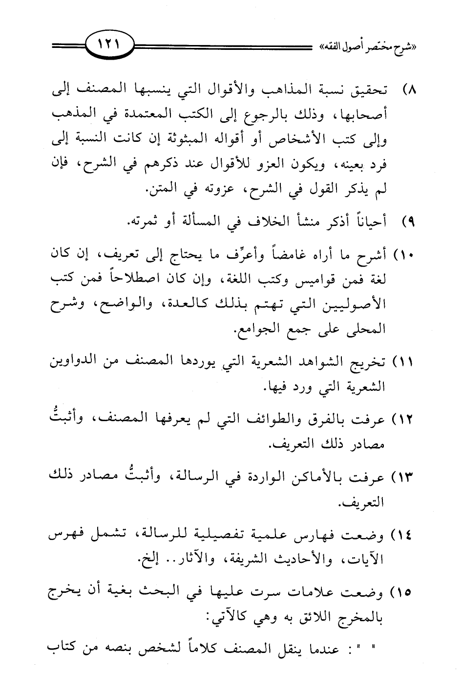 10) أشرح ما أراه غامضًا وأعرِّف ما يحتاج إلى تعريف، إن كان لغة فمن قواميس وكتب اللُّغة، وإن كان اصطلاحًا فمن كتب الأصوليين التي تهتم بذلك كالعدة، والواضح، وشرح المحلى على جمع الجوامع.