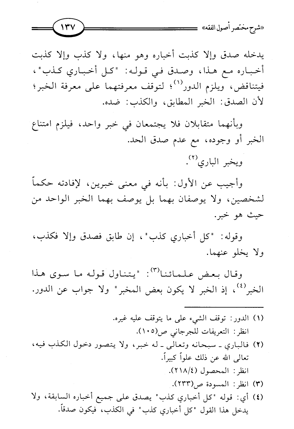 يدخله صدق وإلا كذبت أخباره وهو منها، ولا كذب وإلا كذبت أخباره مع هذا، وصدق في قوله: "كل أخباري كذب"، فيتناقض، ويلزم الدور (¬1)؛ لتوقف معرفتهما على معرفة الخبر؛ لأن الصدق: الخبر المطابق، والكذب: ضده.