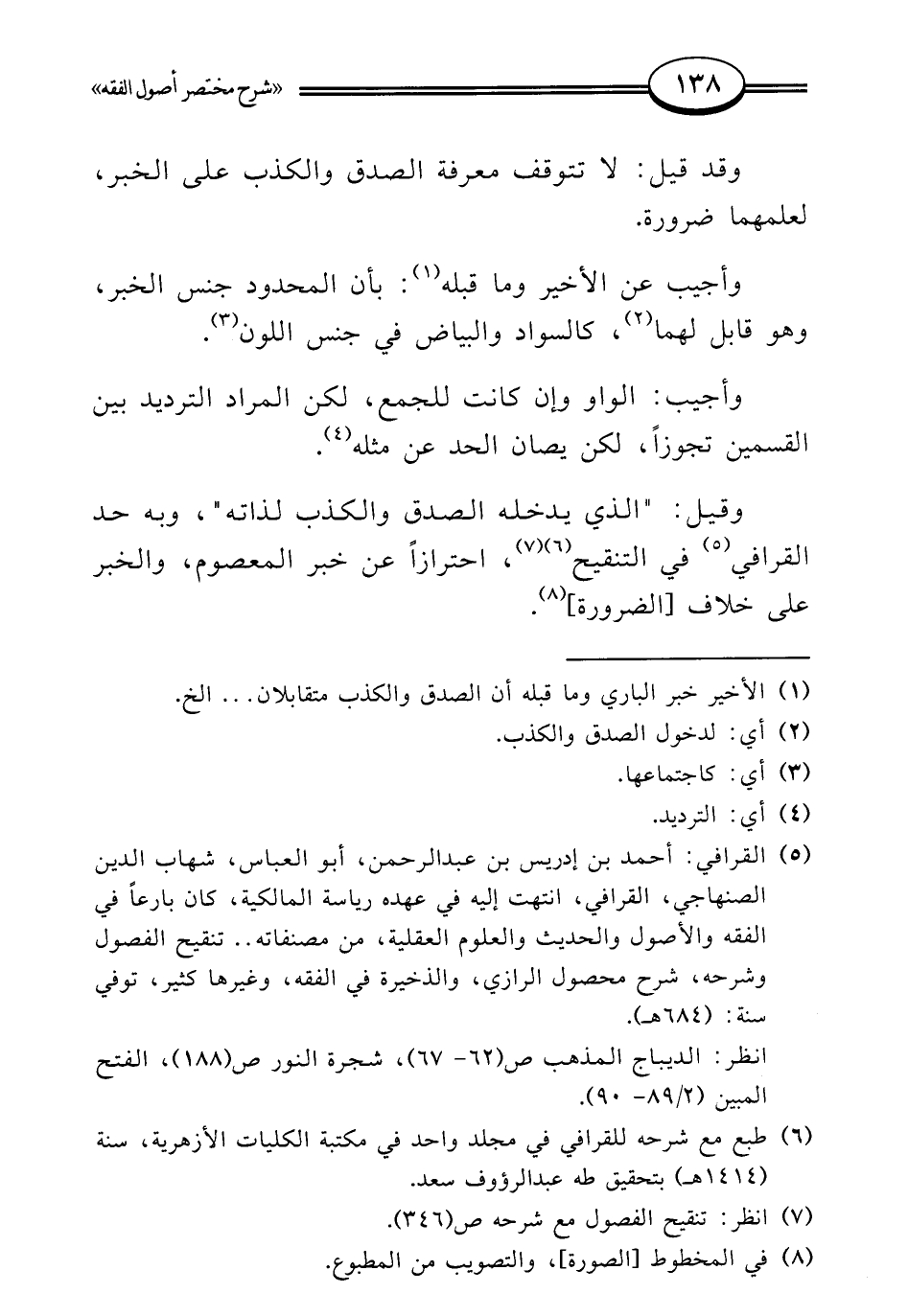 (¬5) القرافي: أحمد بن إدريس بن عبد الرحمن، أبو العباس، شهاب الدين الصنهاجي، القرافي، انتهت إليه في عهده رياسة المالكية، كان بارعًا في الفقه والأصول والحديث والعلوم العقلية، من مصنفاته .. تنقيح الفصول وشرحه، شرح محصول الرازي، والذخيرة في الفقه، وغيرها كثير، توفي سنة: (684 هـ).