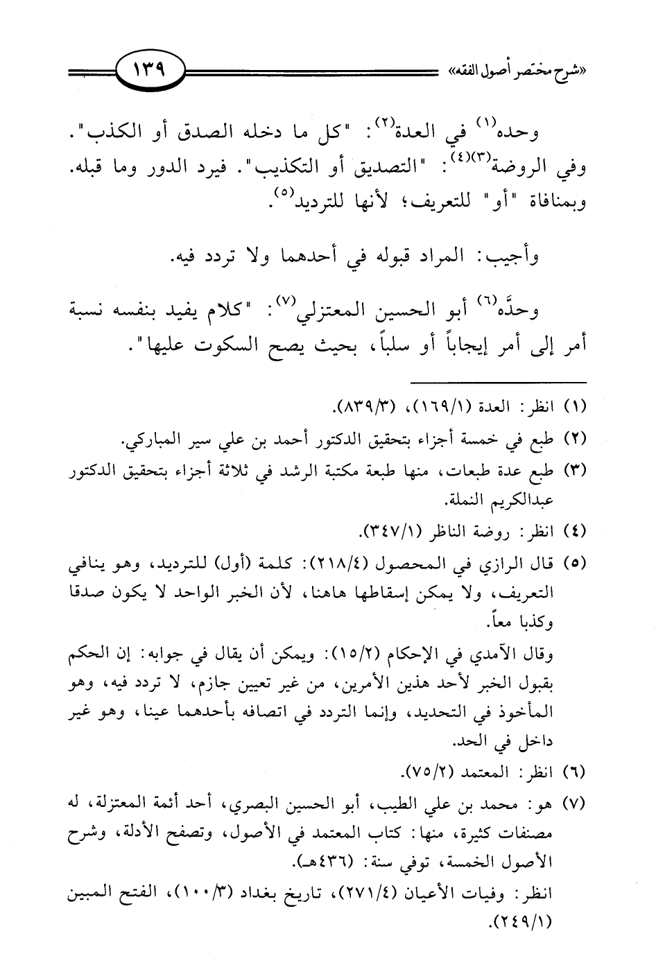 (¬5) قال الرازي في المحصول (4/ 218): كلمة (أول) للترديد، وهو ينافي التعريف، ولا يمكن إسقاطها ها هنا، لأن الخبر الواحد لا يكون صدقا وكذبا معًا.