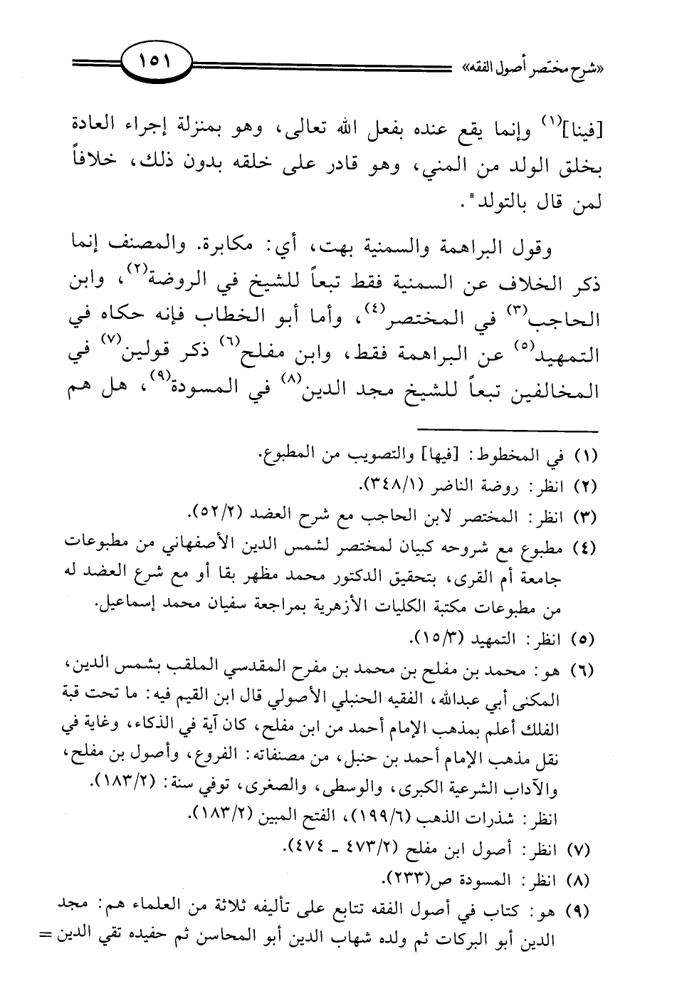 (¬6) هو: محمد بن مفلح بن محمد بن مفرح المقدسي الملقب بشمس الدين، المكنى أبي عبد الله، الفقيه الحنبلي الأصولي قال ابن القيم فيه: ما تحت قبة الفلك أعلم بمذهب الإمام أحمد من ابن مفلح، كان آية في الذكاء، وغاية في نقل مذهب الإمام أحمد بن حنبل، من مصنفاته: الفروع، وأصول بن مفلح، والآداب الشرعية الكبرى، والوسطى، والصغرى، توفي سنة: (2/ 183).