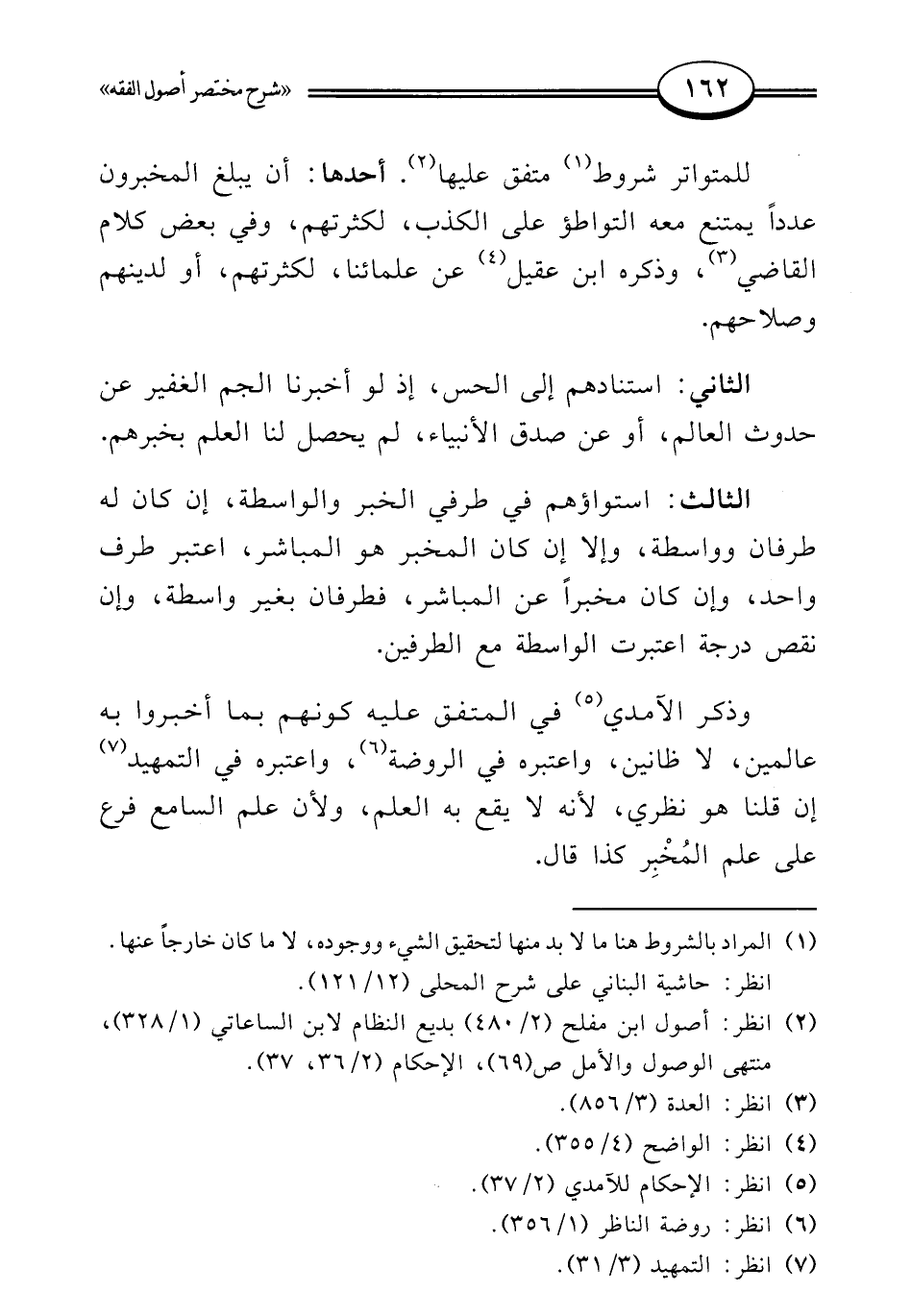 للمتواتر شروط (¬1) متفق عليها (¬2). أحدهما: أن يبلغ المخبرون عددًا يمتنع معه التواطؤ على الكذب، لكثرتهم، وفي بعض كلام القاضي (¬3)، وذكره ابن عقيل (¬4) عن علمائنا، لكثرتهم، أو لدينهم وصلاحهم.