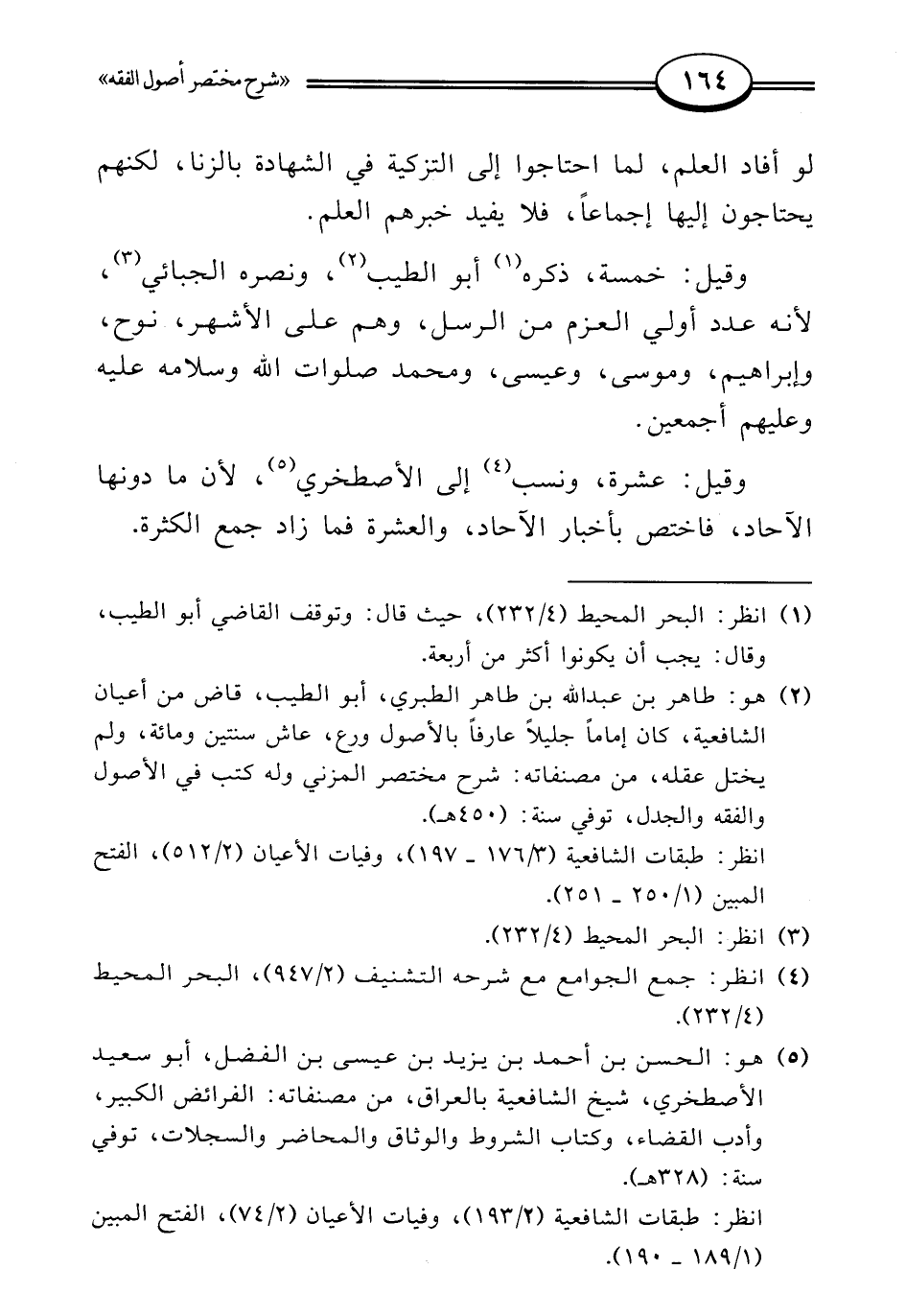 (¬1) انظر: البحر المحيط (4/ 232)، حيث قال: وتوقف القاضي أبو الطيب، وقال: يجب أن يكونوا أكثر من أربعة.