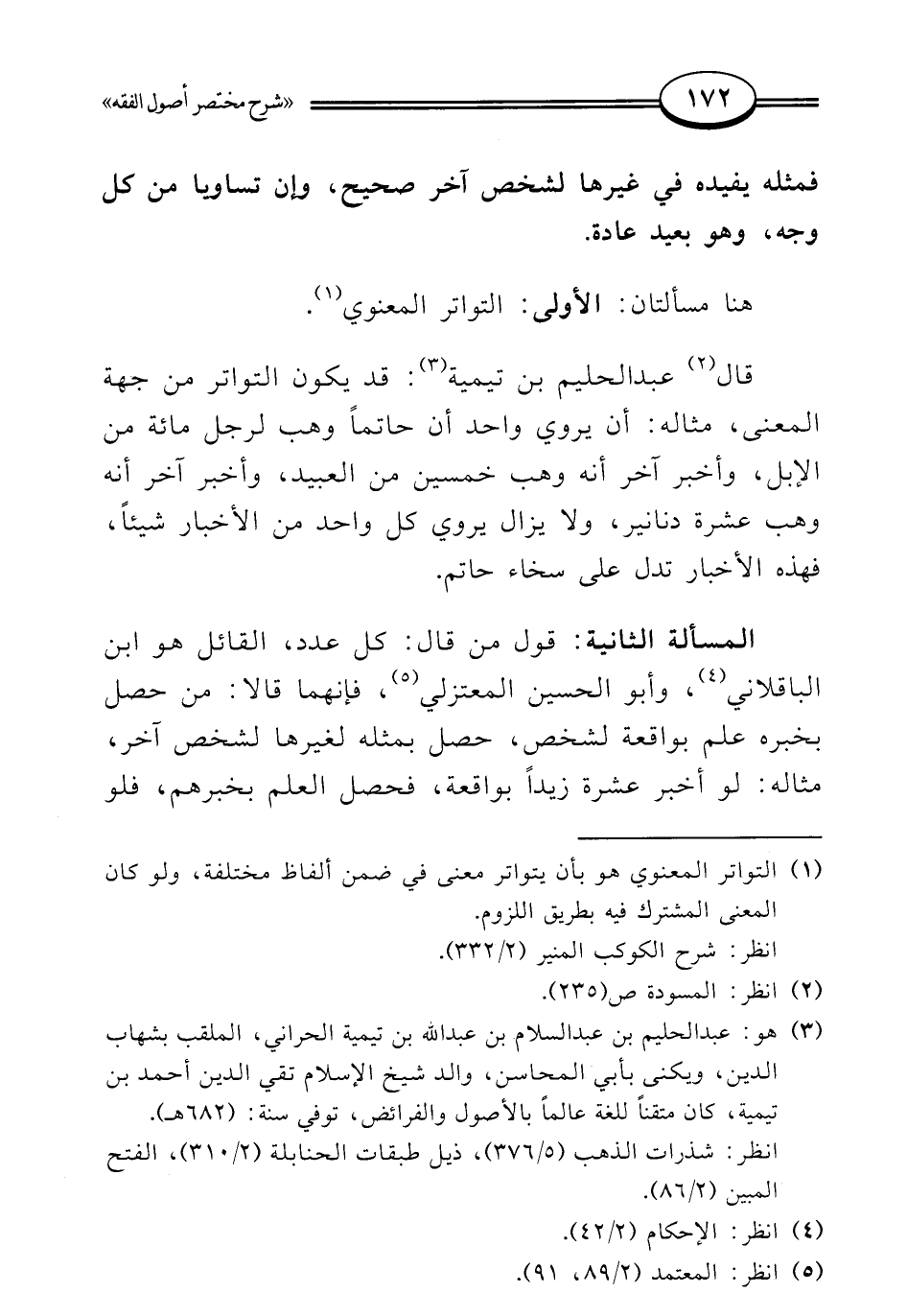 قال (¬2) عبد الحليم بن تيمية (¬3): قد يكون التواتر من جهة المعنى، مثاله: أن يروي واحد أن حاتمًا وهب لرجل مائة من الإبل، وأخبر آخر أنه وهب خمسين من العبيد، وأخبر آخر أنه وهب عشرة دنانير، ولا يزال يروي كل واحد من الأخبار شيئًا، فهذه الأخبار تدل على سخاء حاتم.