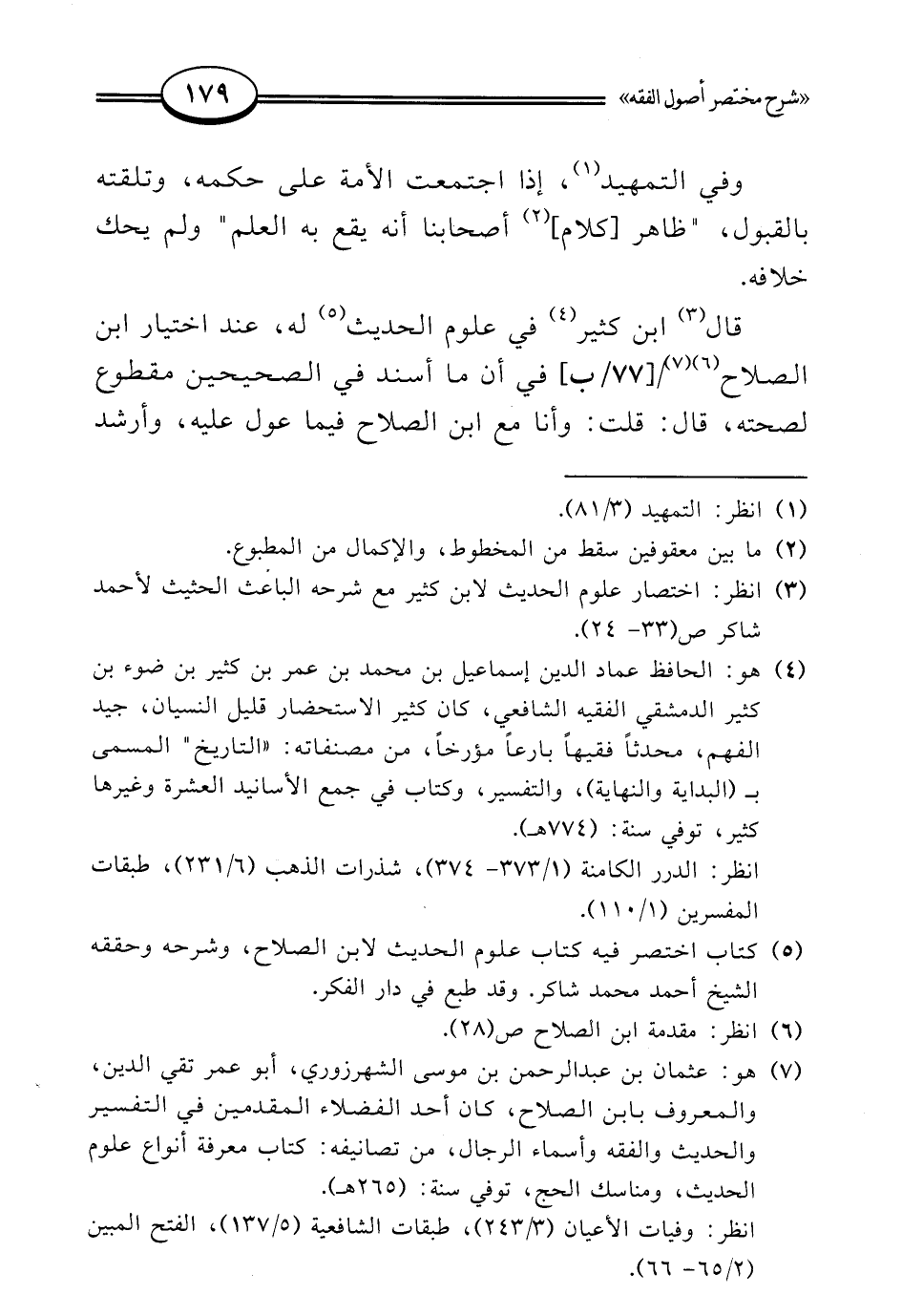 (¬7) هو: عثمان بن عبد الرحمن بن موسى الشهرزوري، أبو عمر تقي الدين، والمعروف بابن الصلاح، كان أحد الفضلاء المقدمين في التفسير والحديث والفقه وأسماء الرجال، من تصانيفه: كتاب معرفة أنواع علوم الحديث، ومناسك الحج، توفي سنة: (265 هـ).