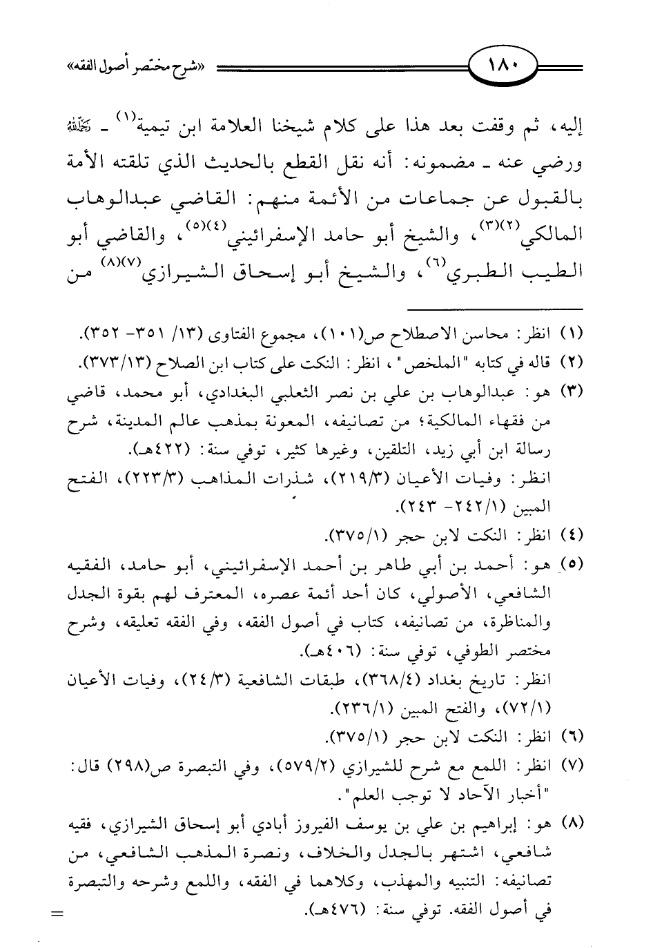 (¬5) هو: أحمد بن أبي طاهر بن أحمد الإسفرائيني، أبو حامد، الفقيه الشافعي، الأصولي، كان أحد أئمة عصره، المعترف لهم بقوة الجدل والمناظرة، من تصانيفه، كتاب في أصول الفقه، وفي الفقه تعليقه، وشرح مختصر الطوفي، توفي سنة: (406 هـ).