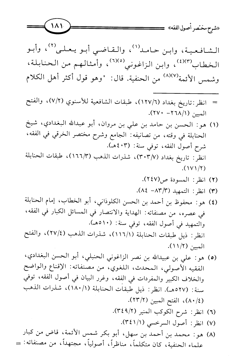 (¬5) هو: علي بن عبيد الله بن نصر الزاغوني الحنبلي، أبو الحسن البغدادي، الفقيه الأصولي، المحدث، اللغوي، من مصنفاته: الإقناع والواضح والخلاف الكبير والمفردات في الفقه، وغرر البيان في أصول الفقه، توفي سنة: (527 هـ). انظر: ذيل طبقات الحنابلة (1/ 180)، شذرات الذهب (4/ 80)، الفتح المبين (2/ 23).