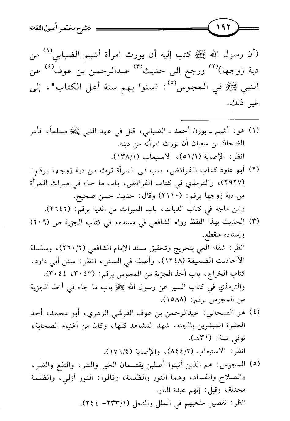 (أن رسول الله -صلى الله عليه وسلم- كتب إليه أن يورث امرأة أشيم الضبابي (¬1) من دية زوجها) (¬2) ورجع إلى حديث (¬3) عبد الرحمن بن عوف (¬4) عن النبي -صلى الله عليه وسلم- في المجوس (¬5): "سنوا بهم سنة أهل الكتاب"، إلى غير ذلك.