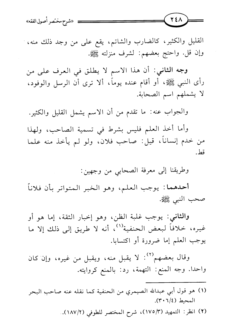 وجه الثاني: أن هذا الاسم لا يطلق في العرف على من رأى النبي - صلى الله عليه وسلم -، أو أقام عنده يومًا، ألا ترى أن الرسل والوفود، لا يشملهم اسم الصحابة.
