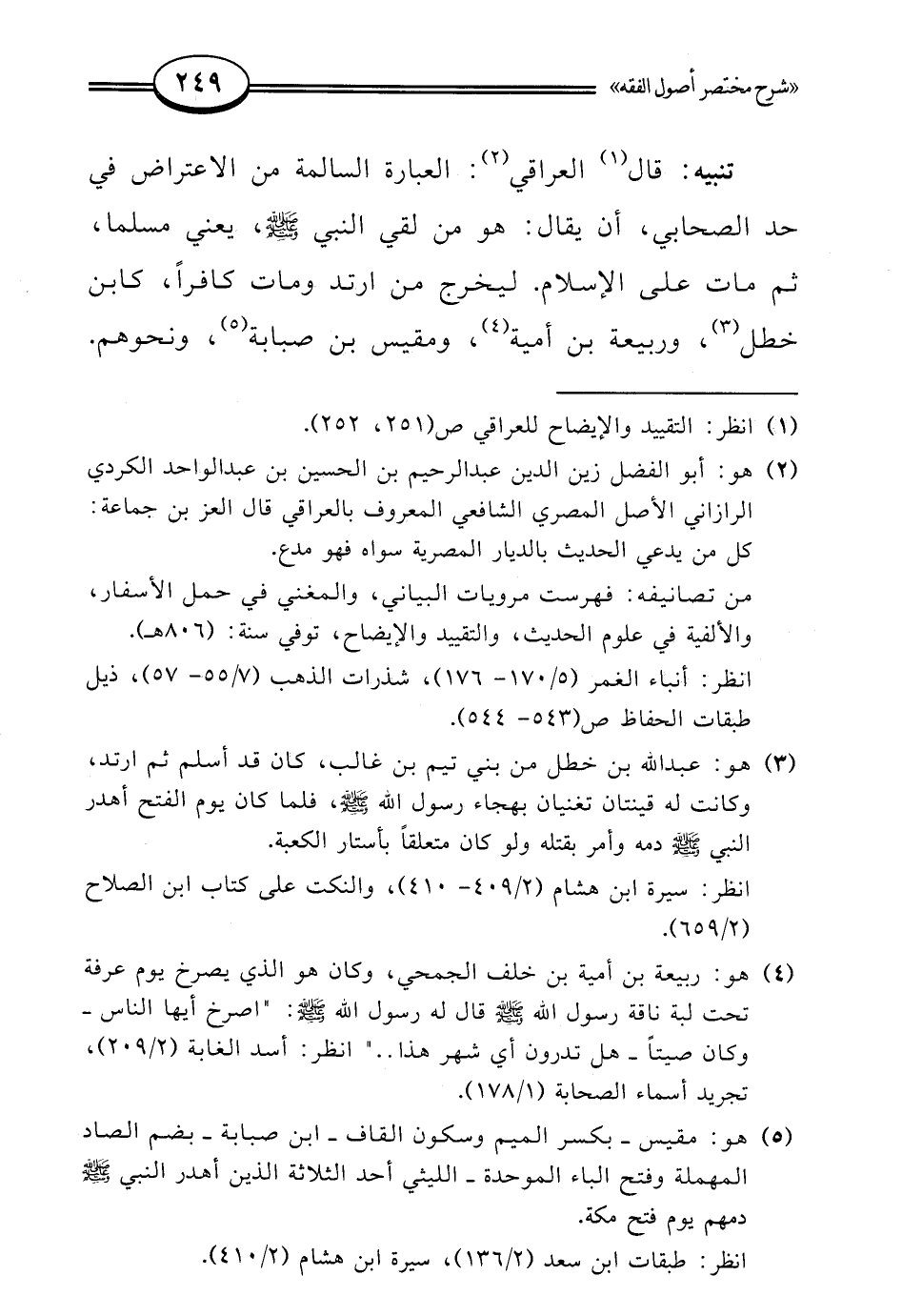 تنبيه: قال (¬1) العراقي (¬2): العبارة السالمة من الاعتراض في حد الصحابي، أن يقال: هو من لقي النبي - صلى الله عليه وسلم -، يعني مسلما، ثم مات على الإسلام. ليخرج من ارتد ومات كافرًا، كابن خطل (¬3)، وربيعة بن أمية (¬4)، ومقيس بن صبابة (¬5)، ونحوهم.