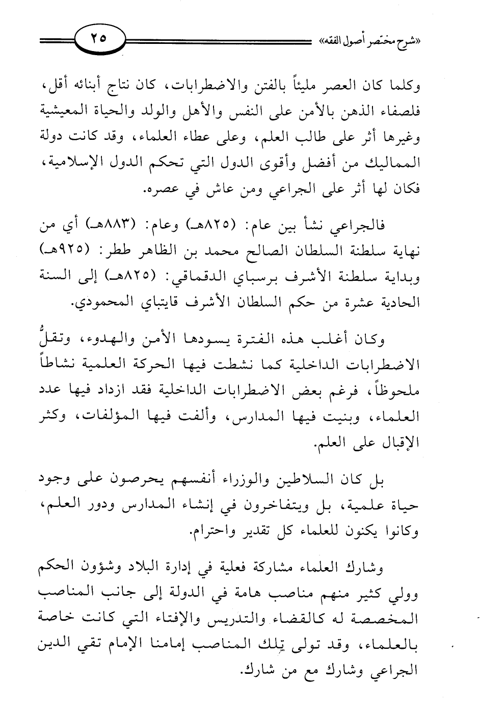 وكلما كان العصر مليئًا بالفتن والاضطرابات، كان نتاج أبنائه أقل، فلصفاء الذهن بالأمن على النفس والأهل والولد والحياة المعيشية وغيرها أثر على طالب العلم، وعلى عطاء العلماء، وقد كانت دولة المماليك من أفضل وأقوى الدول التي تحكم الدول الإسلامية، فكان لها أثر على الجراعي ومن عاش في عصره.