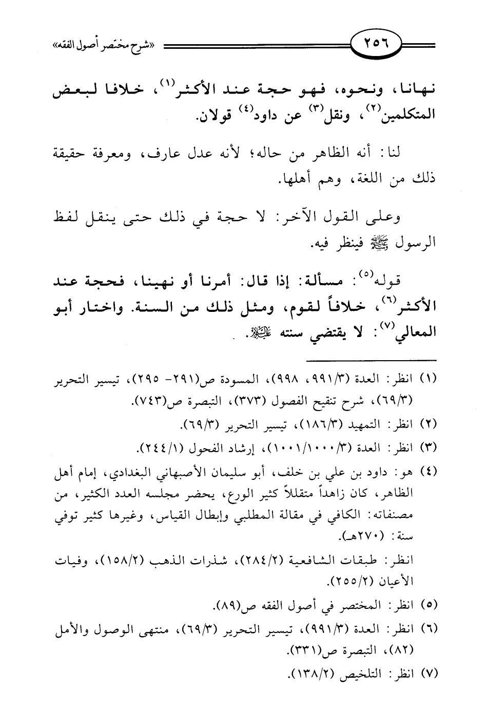 (¬4) هو: داود بن علي بن خلف، أبو سليمان الأصبهاني البغدادي، إمام أهل الظاهر، كان زاهدًا متقللًا كثير الورع، يحضر مجلسه العدد الكثير، من مصنفاته: الكافي في مقالة المطلبي وإبطال القياس، وغيرها كثير توفي سنة: (270 هـ).