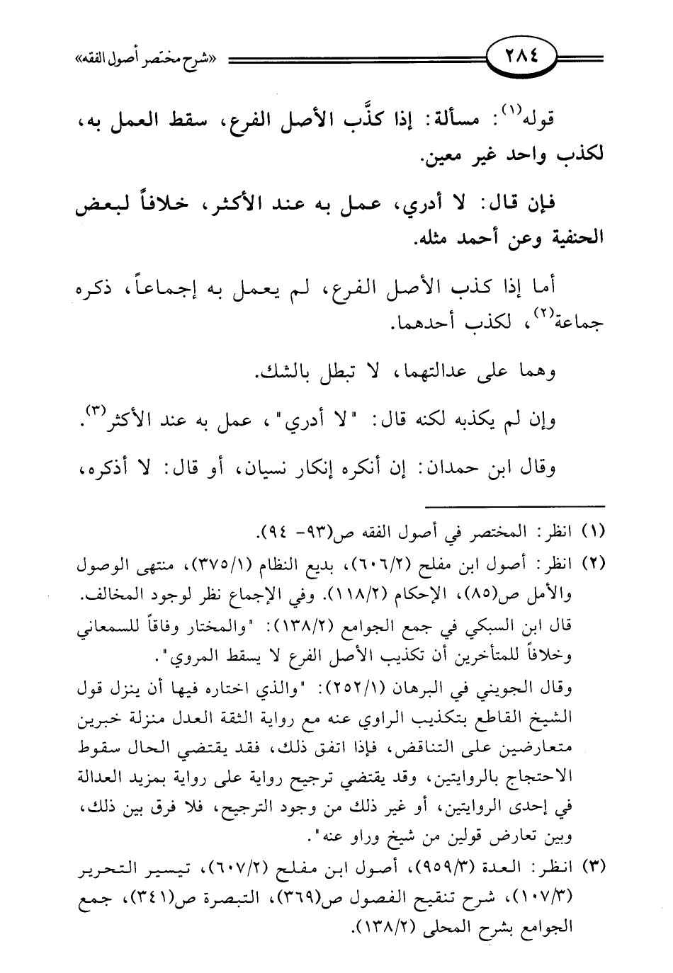 (¬2) انظر: أصول ابن مفلح (2/ 606)، بديع النظام (1/ 375)، منتهى الوصول والأمل ص (85)، الإحكام (2/ 118). وفي الإجماع نظر لوجود المخالف. قال ابن السبكي في جمع الجوامع (2/ 138): "والمختار وفاقًا للسمعاني وخلافًا للمتأخرين أن تكذيب الأصل الفرع لا يسقط المروي".