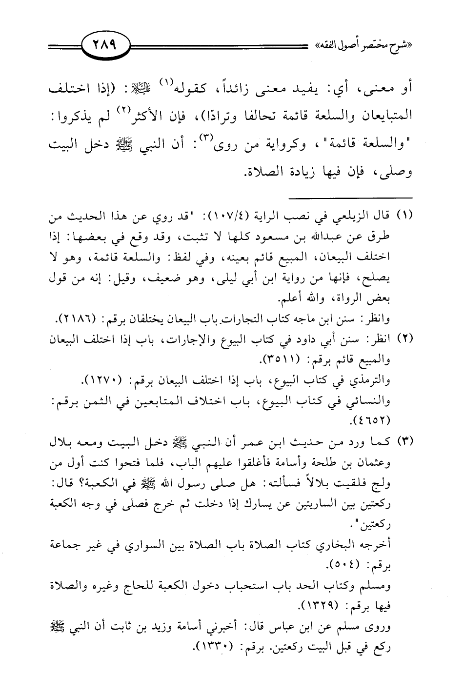 أو معنى، أي: يفيد معنى زائدًا، كقوله (¬1) - عَلَيْهِ السَّلَامُ -: (إذا اختلف المتبايعان والسلعة قائمة تحالفا وترادّا)، فإن الأكثر (¬2) لم يذكروا: "والسلعة قائمة"، وكرواية من روى (¬3): ان النبي - صلى الله عليه وسلم - دخل البيت وصلى، فإن فيها زيادة الصلاة.