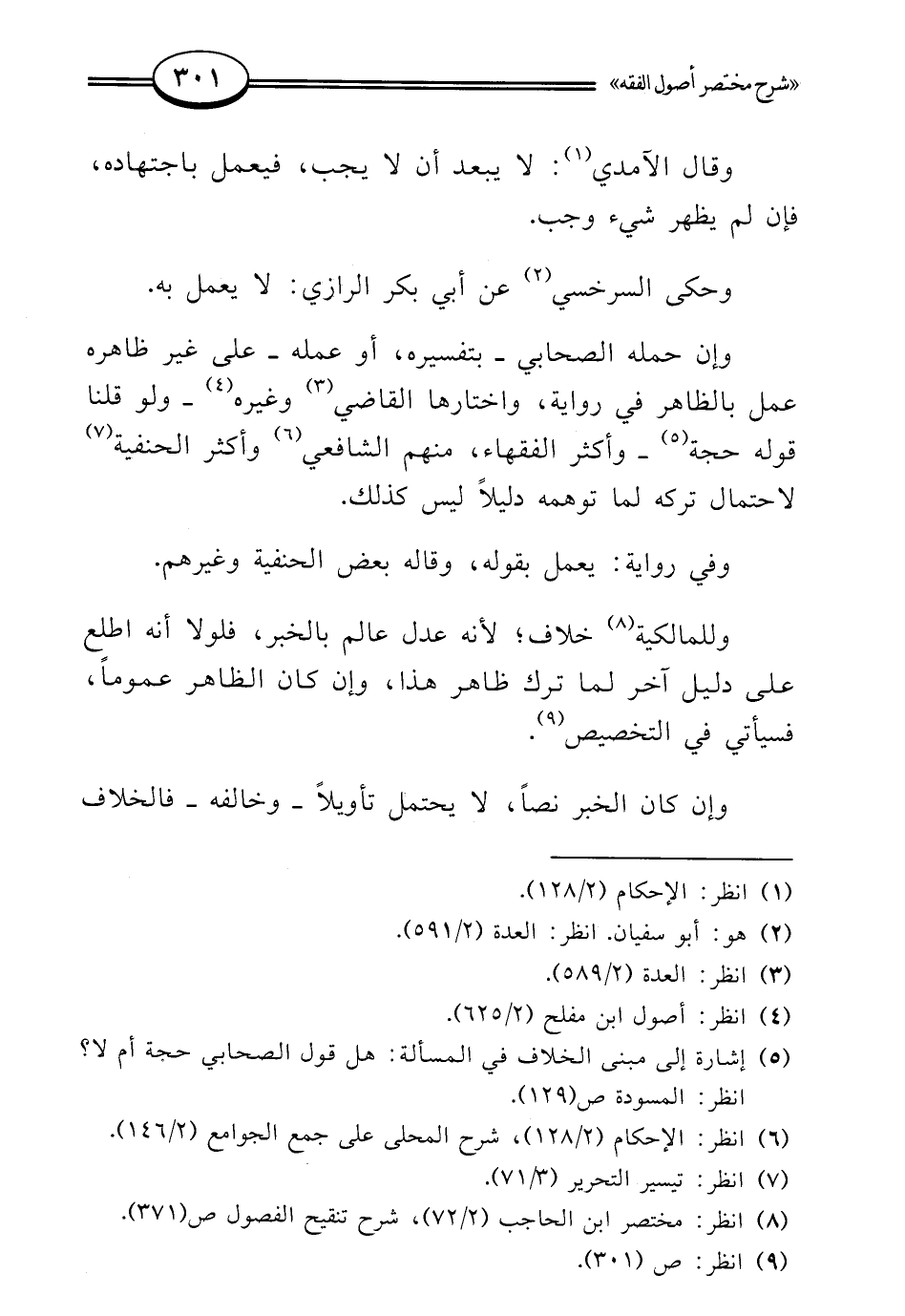 (¬8) انظر: مختصر ابن الحاجب (2/ 72)، شرح تنقيح الفصول ص (371).