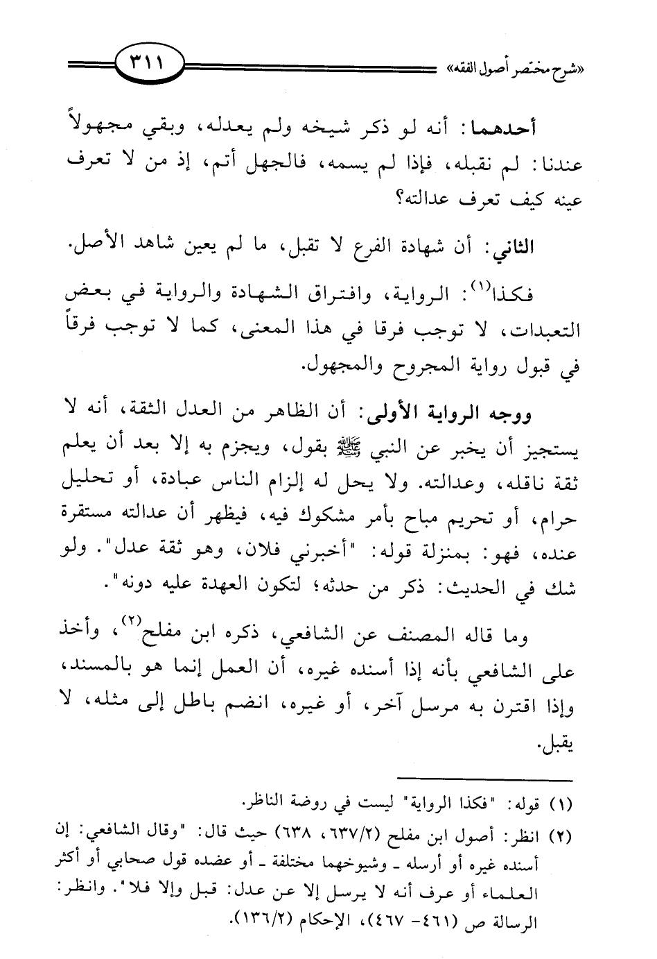 (¬2) انظر: أصول ابن مفلح (2/ 637، 638) حيث قال: "وقال الشافعي: إن أسنده غيره أو أرسله - وشيوخهما مختلفة - أو عضده قول صحابي أو أكثر العلماء أو عرف أنه لا يرسل إلا عن عدل: قبل وإلا فلا". وانظر: الرسالة ص (461 - 467)، الإحكام (2/ 136).