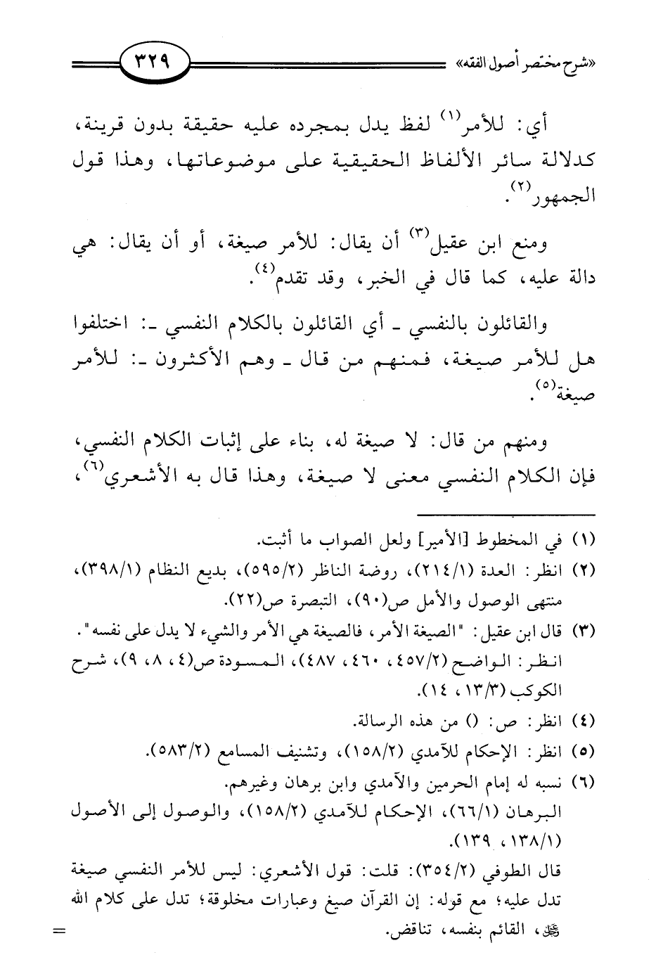 قال الطوفي (2/ 354): قلت: قول الأشعري: ليس للأمر النفسي صيغة تدل عليه، مع قوله: إن القرآن صيغ وعبارات مخلوقة، تدل على كلام الله - عَزَّ وَجَلَّ -، القائم بنفسه، تناقض. =