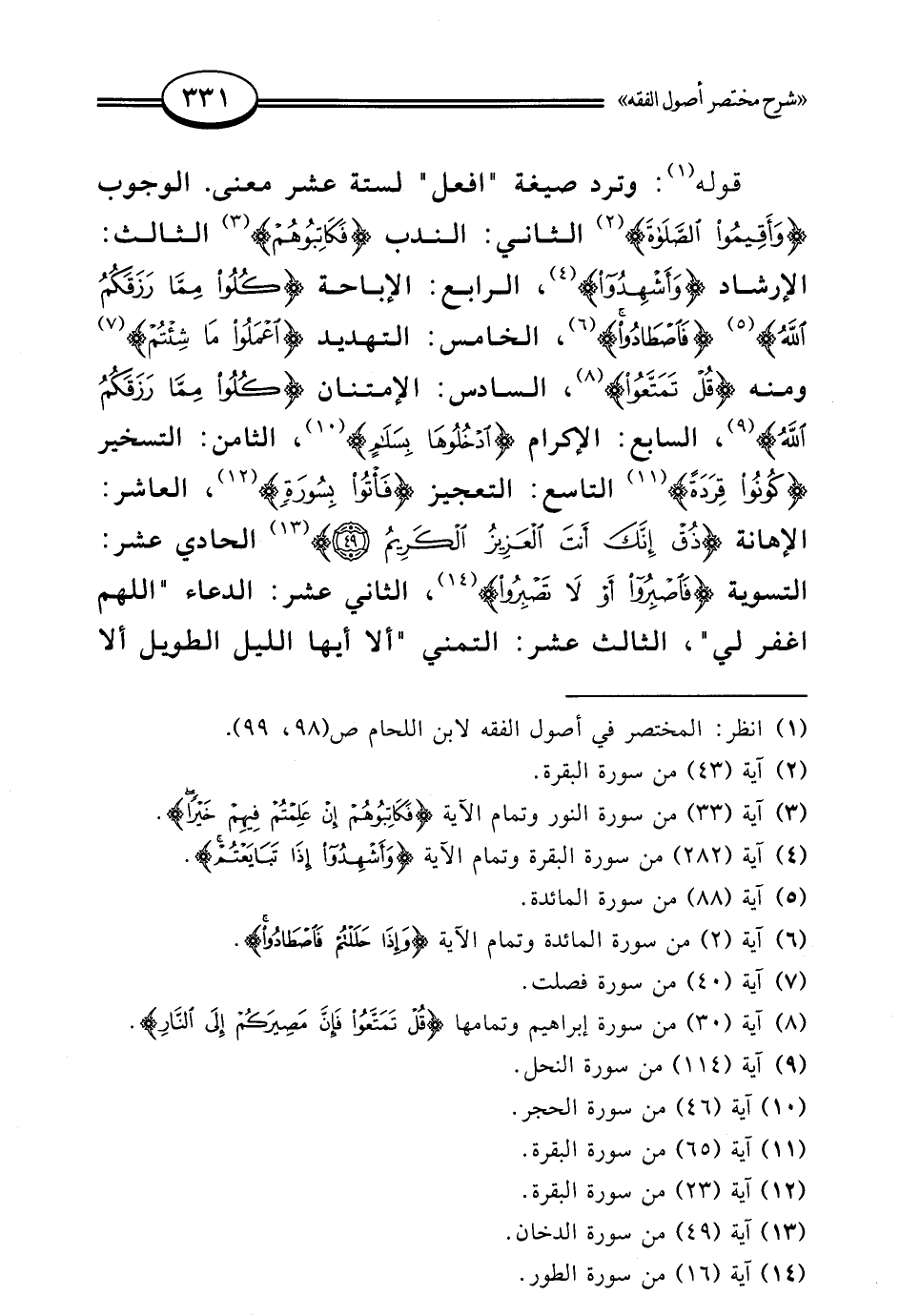 قوله (¬1): وترد صيغة "افعل" لستة عشر معنى. الوجوب {وَأَقِيمُوا الصَّلَاةَ} (¬2) الثاني: الندب {فَكَاتِبُوهُمْ} (¬3) الثالث: الإرشاد {وَأَشْهِدُوا} (¬4)، الرابع: الإباحة {وَكُلُوا مِمَّا رَزَقَكُمُ اللَّهُ} (¬5) {فَاصْطَادُوا} (¬6)، الخامس: التهديد {اعْمَلُوا مَا شِئْتُمْ} (¬7) ومنه {قُلْ تَمَتَّعُوا} (¬8)، السادس: الإمتنان {وَكُلُوا مِمَّا رَزَقَكُمُ اللَّهُ} (¬9)، السابع: {ادْخُلُوهَا بِسَلَامٍ} (¬10)، الثامن: التسخير {كُونُوا قِرَدَةً} (¬11) التاسع: التعجيز {فَأْتُوا بِسُورَةٍ} (¬12)، العاشر: الإهانة {ذُقْ إِنَّكَ أَنْتَ الْعَزِيزُ الْكَرِيمُ (49)} (¬13) الحادي عشر: التسوية {فَاصْبِرُوا أَوْ لَا تَصْبِرُوا} (¬14)، الثاني عشر: الدعاء "اللهم اغفر لي"، الثالث عشر: التمني "ألا أيها الليل الطويل ألا