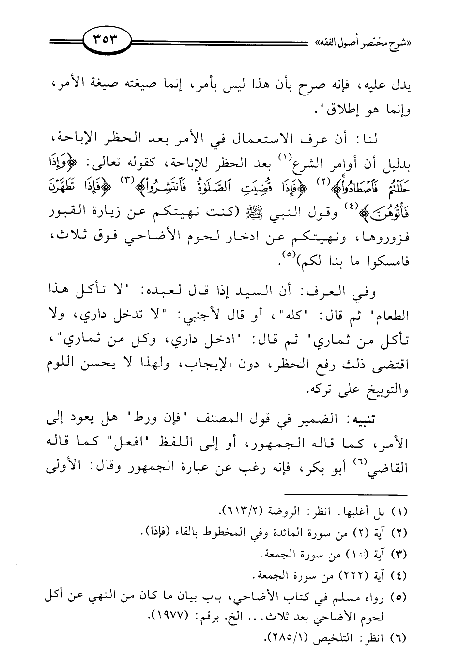 لنا: أن عرف الاستعمال في الأمر بعد الحظر الإباحة، بدليل أن أوامر الشرع (¬1) بعد الحظر للإباحة، كقوله تعالى: {وَإِذَا حَلَلْتُمْ فَاصْطَادُوا} (¬2) {فَإِذَا قُضِيَتِ الصَّلَاةُ فَانْتَشِرُوا} (¬3) {فَإِذَا تَطَهَّرْنَ فَأْتُوهُنَّ} (¬4) وقول النبي - صلى الله عليه وسلم - (كنت نهيتكم عن زيارة القبور فزوروها، ونهيتكم عن ادخار لحوم الأضاحي فوق ثلاث، فامسكوا ما بدا لكم) (¬5).